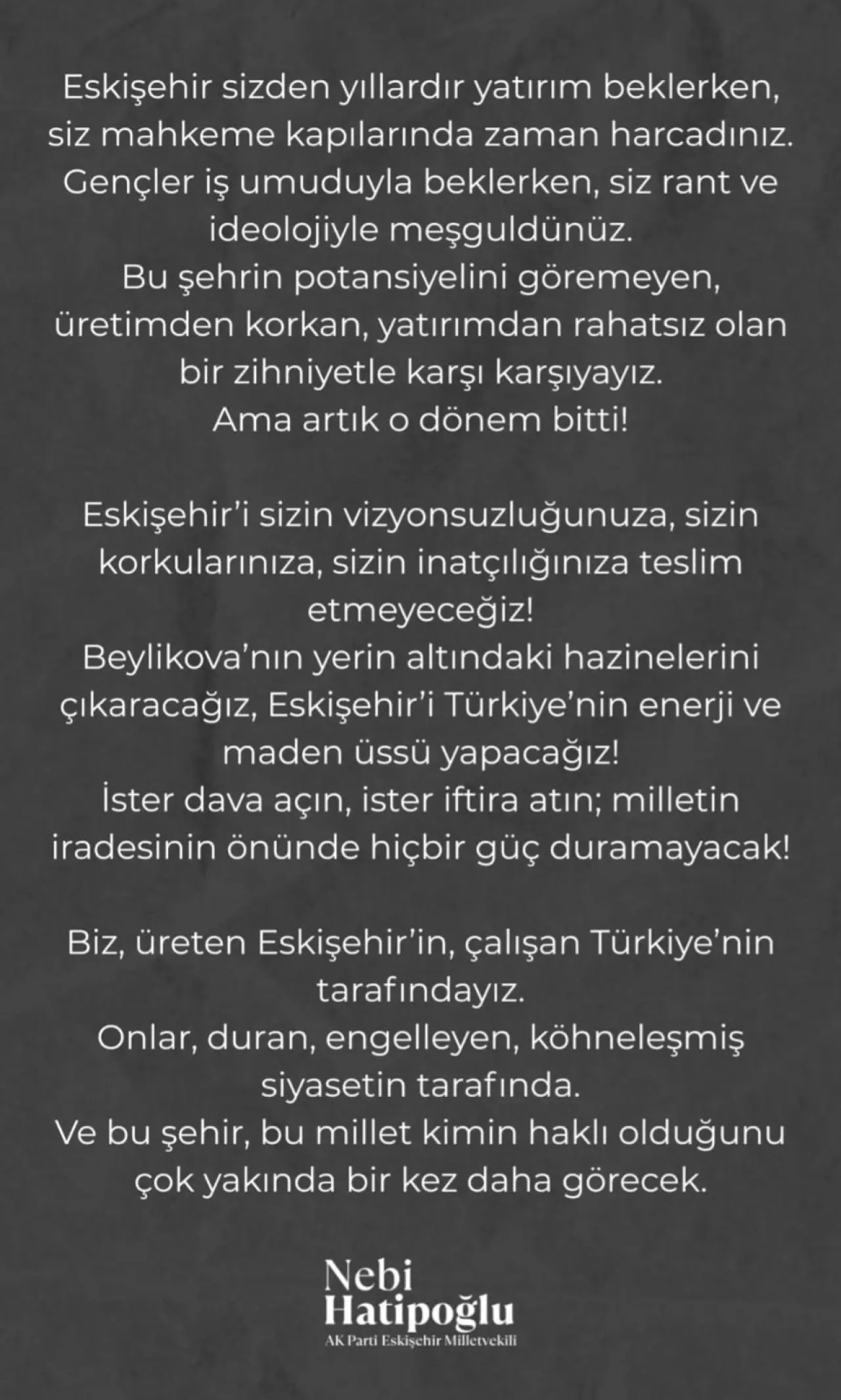 Bir diğer paylaşımında ise Hatipoğlu, “Beylikova’nın yer altındaki hazinelerini çıkaracağız, Eskişehir’i Türkiye’nin enerji ve maden üssü yapacağız. İster dava açın ister iftira atın; milletin iradesinin önünde hiçbir güç duramayacak!” ifadelerini kullandı.