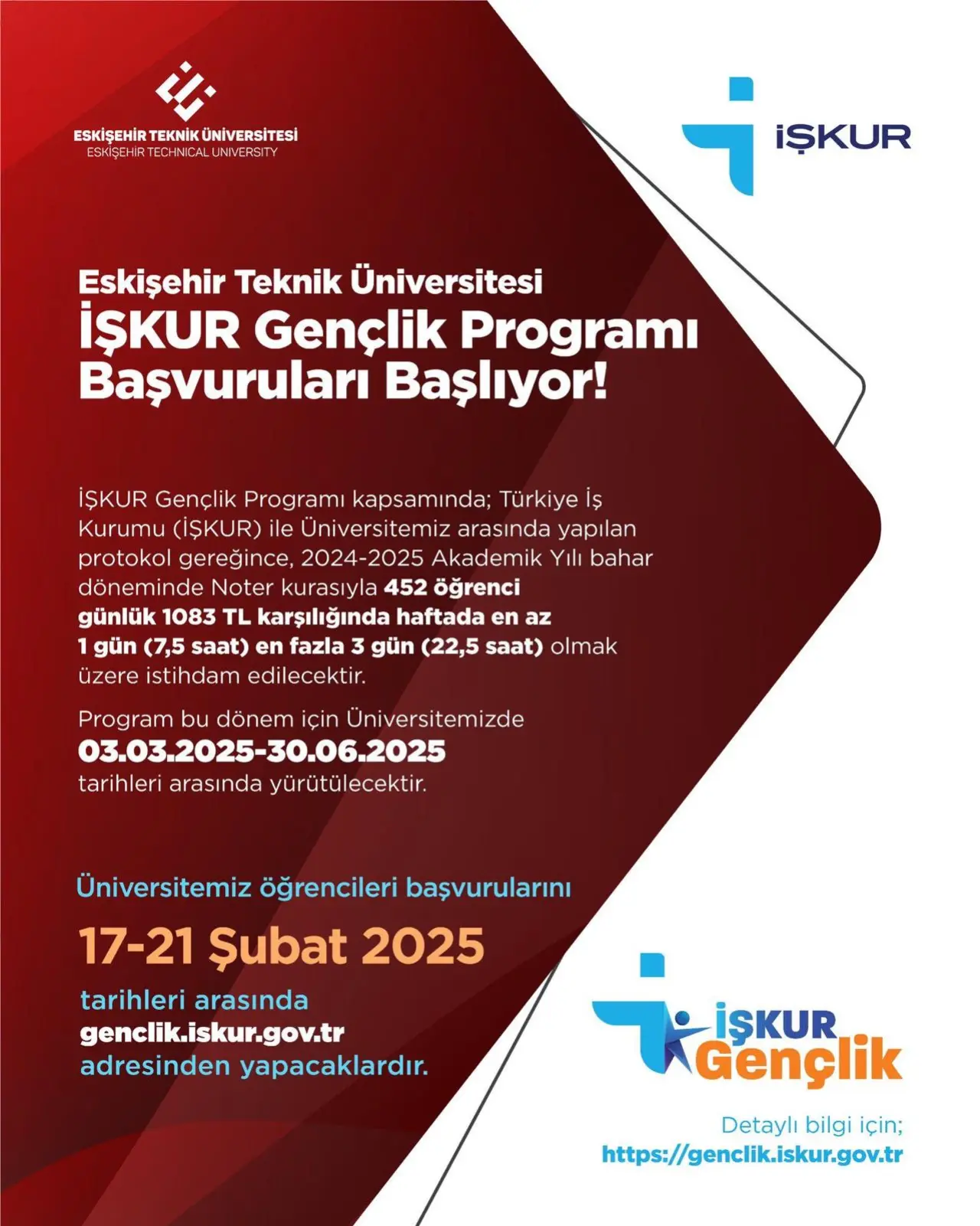 Program, 03.03.2025 - 30.06.2025 tarihleri arasında Eskişehir Teknik Üniversitesi’nde yürütülecek. Üniversite öğrencileri, başvurularını 17-21 Şubat 2025 tarihleri arasında genclik.iskur.gov.tr adresinden yapabilecekler.