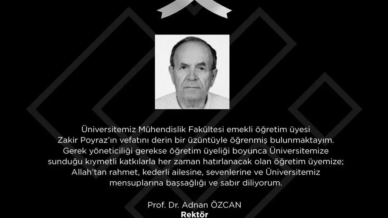 "Üniversitemiz Mühendislik Fakültesi emekli öğretim üyesi Zakir Poyraz'ın vefatını derin bir üzüntüyle öğrenmiş bulunmaktayım. Gerek yöneticiliği gerekse öğretim üyeliği boyunca Üniversitemize sunduğu kıymetli katkılarla her zaman hatırlanacak olan öğretim üyemize; Allah'tan rahmet, kederli ailesine, sevenlerine ve Üniversitemiz mensuplarına başsağlığı ve sabır diliyorum."