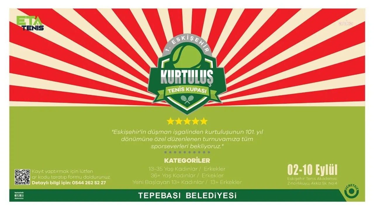 Tepebaşı Belediyesi ve ETA Tenis iş birliği ile düzenlenecek tenis turnuvası için kayıtlar başladı. Eskişehir’in düşman işgalinden kurtuluşunun 101’inci yılına özel düzenlenen turnuvaya 13-35 yaş, 36 yaş ve üzeri ile yeni başlayan 13 yaş ve üzeri sporseverler başvurabiliyor. 02-10 Eylül arasında gerçekleşecek turnuvaya katılmak isteyenler, duyuru görselinde bulunan QR kodu okutarak formu doldurabiliyor. Ayrıca detaylı bilgi almak isteyenler 0 (544) 262 52 27 numaralı telefondan yetkililere ulaşabiliyor.
