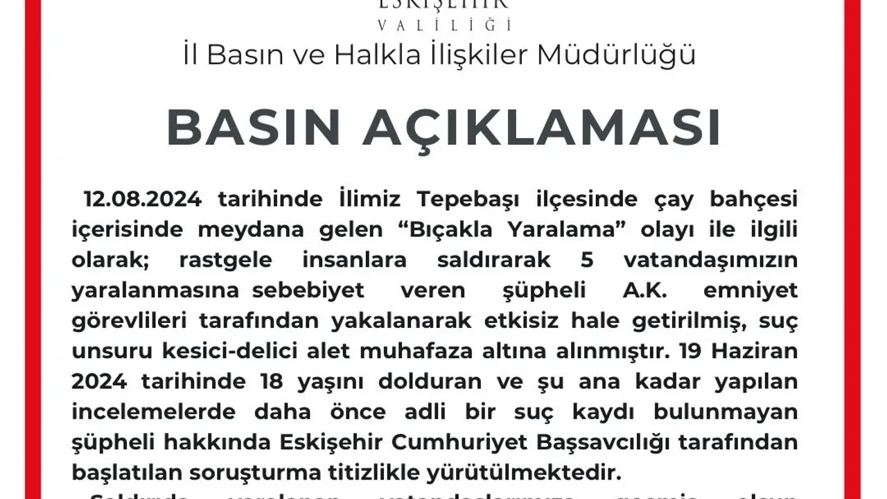 '12.08.2024 tarihinde ilimiz Tepebasi ilçesinde çay bahçesi içerisinde meydana gelen 'Bıçakla Yaralama' olayı ile ilgili olarak; rastgele insanlara saldırarak 5 vatandaşımızın yaralanmasına sebebiyet veren şüpheli A.K. emniyet görevlileri tarafından yakalanarak etkisiz hale getirilmiş, suç unsuru kesici-delici alet muhafaza altına alınmıştır. 19 Haziran 2024 tarihinde 18 yaşını dolduran ve şu ana kadar yapılan incelemelerde daha önce adli bir suç kaydı bulunmayan şüpheli hakkında Eskişehir Cumhuriyet Başsavcılığı tarafından başlatılan soruşturma titizlikle yürütülmektedir. Saldırıda yaralanan vatandaşlarımıza geçmiş olsun dileklerimizi iletir, acil şifalar dileriz.'