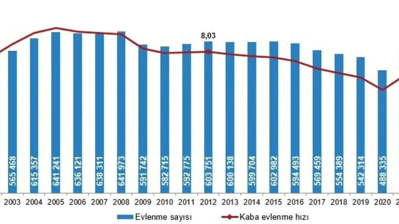 TÜİK hem Türkiye geneli hem de illerle ilgili 2023 yılına ait evlenme ve boşanma istatistiklerini paylaştı. Yayınlanan verilere göre, evlenen çiftlerin sayısı 2022 yılında 575 bin 891 iken, 2023 yılında 565 bin 435 oldu. Bin nüfus başına düşen evlenme sayısını ifade eden kaba evlenme hızı 2023 yılında binde 6,63 olarak gerçekleşti. Boşanan çiftlerin sayısı 2022 yılında 182 bin 437 iken, 2023 yılında 171 bin 881 oldu. Bin nüfus başına düşen boşanma sayısını ifade eden kaba boşanma hızı ise 2023 yılında binde 2,01 olarak gerçekleşti. Yıllara göre ortalama ilk evlenme yaşı incelendiğinde, her iki cinsiyette de ilk evlenme yaşının arttığı görüldü. Ortalama ilk evlenme yaşı 2023 yılında erkeklerde 28,3 iken kadınlarda 25,7 oldu. Erkek ile kadın arasındaki ortalama ilk evlenme yaş farkı ise 2,6 yaş olarak gerçekleşti. Kentte 2023 yılında toplam 2 bin 519 boşanma oldu Eskişehir için yayınlanan verilere göre, evlenen çiftlerin sayısı 2022 yılında 5 bin 875 iken, 2023 yılında 6 bin 31 oldu. Ortalama ilk evlenme yaşı 2022 yılında erkeklerde 28,8, kadınlarda 26,6, 2023 yılında erkeklerde 28,8, kadınlarda 26,5 oldu. Bin nüfus başına düşen boşanma sayısını ifade eden kaba evlenme hızı 2022 yılında binde 6,51, 2023 yılında 6,62 olarak gerçekleşti. Boşanan çiftlerin sayısı 2022 yılında 2 bin 485 iken, 2023 yılında 2 bin 519 oldu. Bin nüfus başına düşen boşanma sayısını ifade eden kaba boşanma hızı 2022 yılında binde 2,75, 2023 yılında 2,77 olarak gerçekleşti. Evlilik süresine göre boşanmalar ise 2023 yılında toplam 2 bin 519, 1 yıldan az 67, 1 yılda 227, 2 yılda 163, 3 yılda 134, 4 yılda 118, 5 yılda 126, 6-10 yılda 568, 11-15 yılda 359, 16 yıl ve üzeri 756, bilinmeyen 1 oldu.