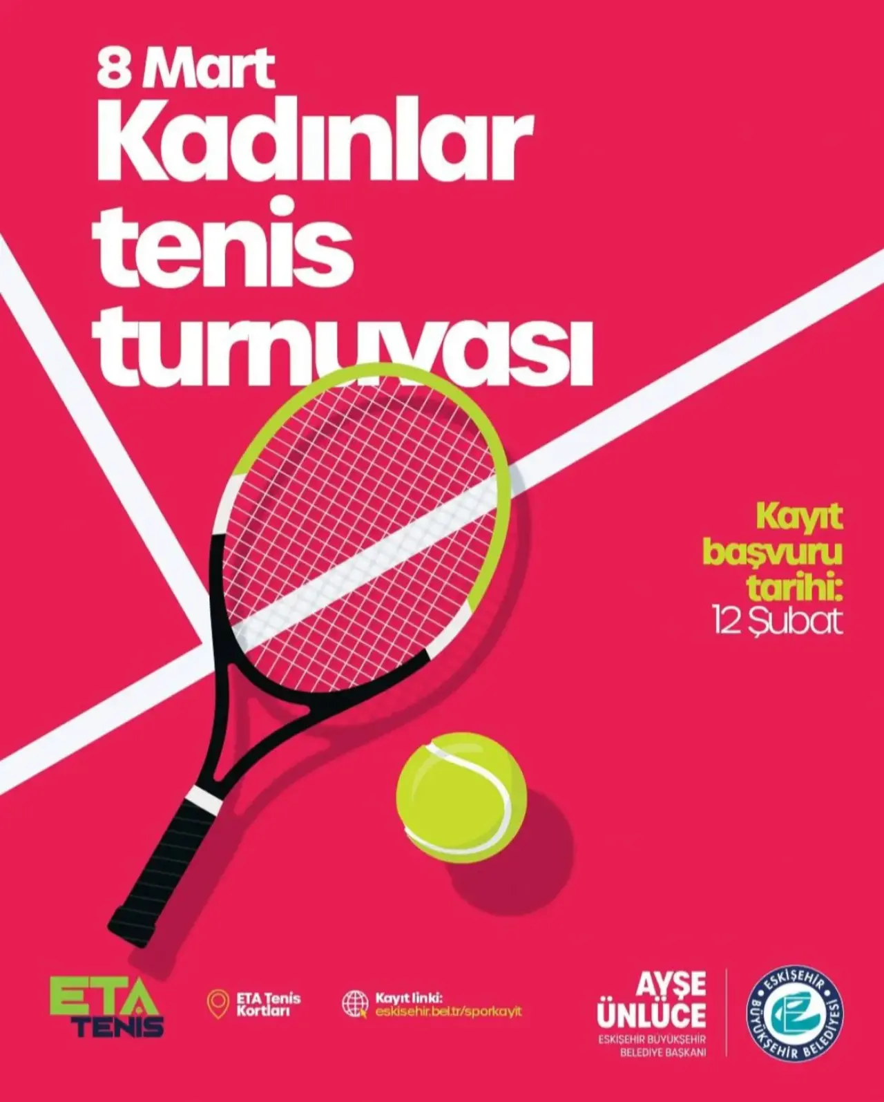 Eskişehir Büyükşehir Belediyesi ve Eskişehir Tenis Akademisi iş birliğiyle, 8 Mart Dünya Emekçi Kadınlar Günü’ne özel Kadınlar Tenis Turnuvası düzenlenecek. Turnuvaya katılmak isteyenler, 12 Şubat itibarıyla kayıtlarını eskisehir.bel.tr/sporkayit adresinden oluşturabilecek.
