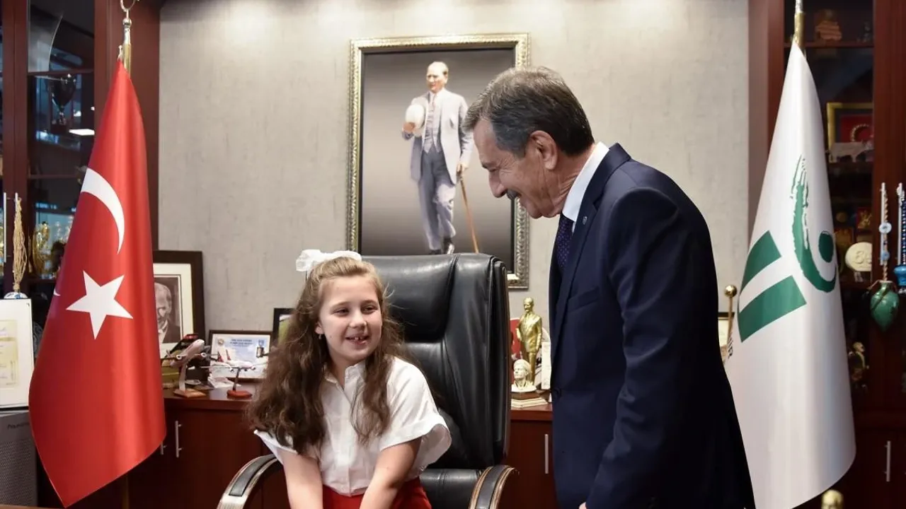 Tepebaşı Belediye Başkanı Dt. Ahmet Ataç’ın makamında, 23 Nisan Ulusal Egemenlik ve Çocuk Bayramı dolayısıyla özel bir buluşma gerçekleşti. 23 Nisan Ulusal Egemenlik ve Çocuk Bayramı’yla ilgili konuşan Başkan Ataç, “Ulu Önder Mustafa Kemal Atatürk’ün izinde çocuklar yetiştirmek için var gücümüzle çalışmaya devam edeceğiz” dedi. Başkan Ataç 23 Nisan dolayısıyla makamını Adalet İlkokulu 3. sınıf öğrencisi Derin Aydemir’e emanet etti. Aynı zamanda İki Elin Sesi Var Çocuk ve Gençlik Senfoni Orkestrası öğrencisi olan Derin Aydemir’i makam koltuğuna oturtan Başkan Ataç, “Tüm çocuklarımızın 23 Nisan’ı kutlu olsun. Bugün Sevgili Derin’i başkan yaptık, belediyeyi kendisi yönetecek. Çocuklarımızın müzikle uğraşması beni çok mutlu ediyor. Mustafa Kemal Atatürk de sanata çok büyük önem verirdi. Biz de Ulu Önder Mustafa Kemal Atatürk’ün izinde çocuklar yetiştirmek için var gücümüzle çalışmaya devam edeceğiz” dedi. Başkan Ataç’ın makamına oturan Derin Aydemir de “Daha fazla park ve kreş olsun, daha fazla sosyal etkinlikler düzenlensin istiyorum. Konserler, festivaller, sergiler çoğalsın isterim. İnsanların sosyalleşmeye, morallerinin yükselmesine ihtiyaçları oluyor” dedi. Derin Aydemir daha sonra Başkan Ataç için kısa bir viyola dinletisi gerçekleştirdi. Başkan Ataç soruları yanıtladı