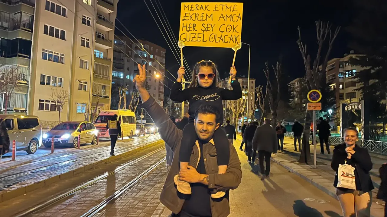 Yürüyüş sırasında dikkat çeken anlardan biri ise küçük bir çocuğun taşıdığı pankart oldu. “Merak etme Ekrem Amca, her şey çok güzel olacak” yazılı pankart, kalabalığın ilgisini çekti.