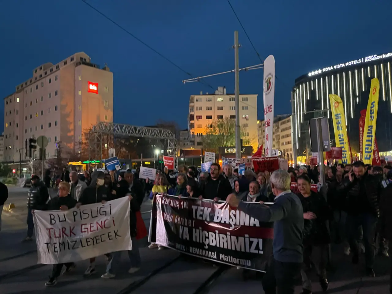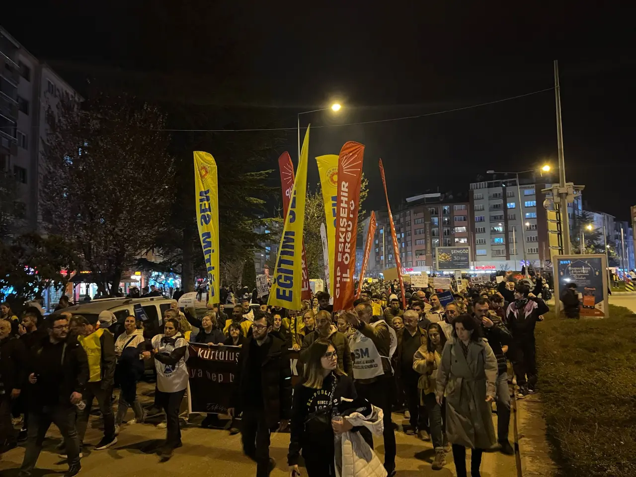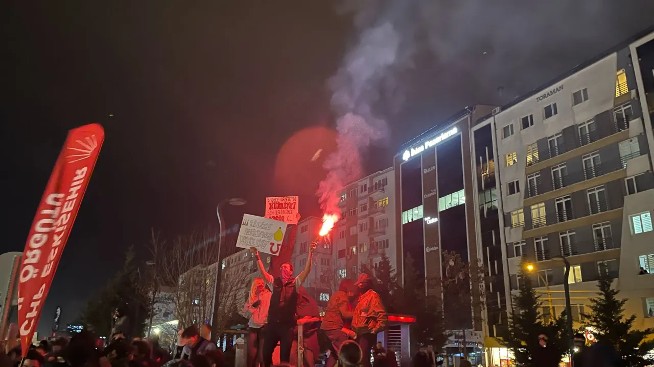 İstanbul Büyükşehir Belediye Başkanı Ekrem İmamoğlu’nun tutuklanmasının ardından Eskişehir’de düzenlenen protesto yürüyüşü, Ulus Anıtı’nda devam ediyor. Akşam saatlerinde Kanatlı AVM önünden başlayan kalabalık, sloganlar eşliğinde Seylap ve Hatboyu güzergâhını takip ederek tekrar Ulus Anıtı çevresine ulaştı.