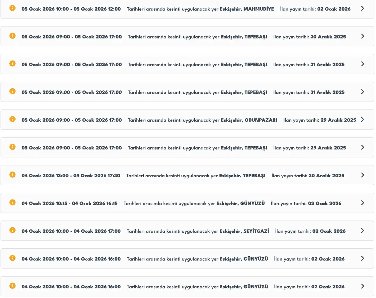 4 Ocak 2026 Eskişehir Planlı Elektrik Kesintisi Listesi