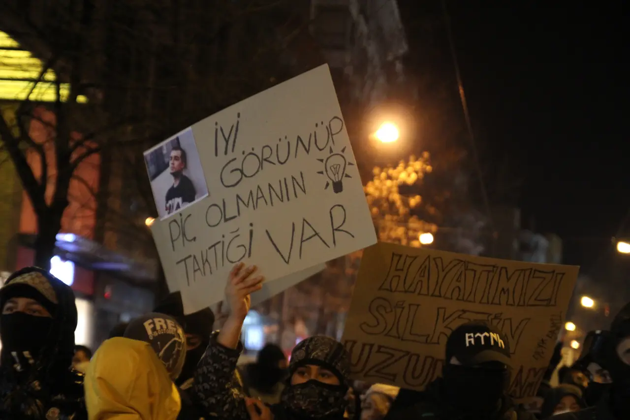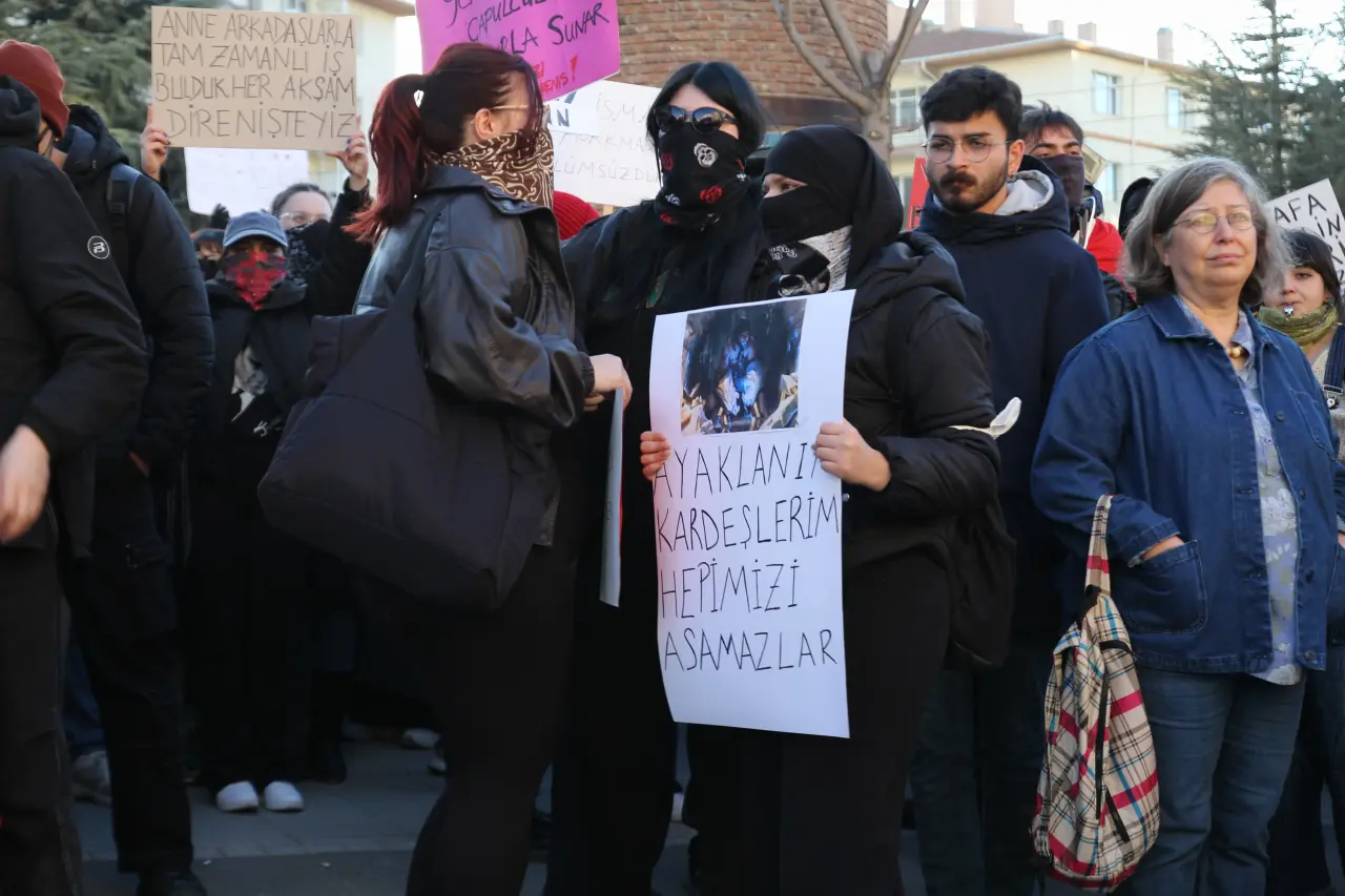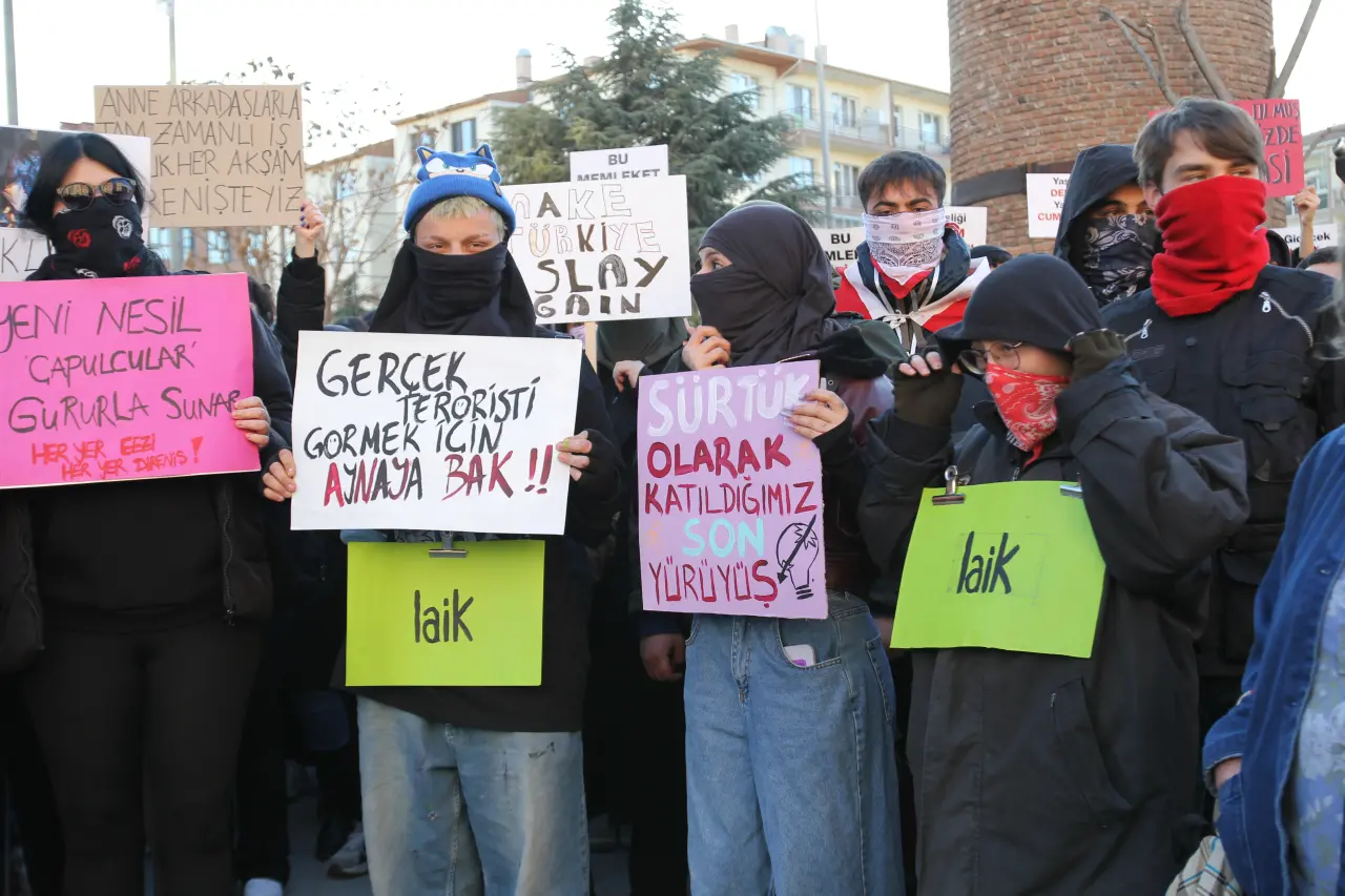 Kalabalık arasında bazı katılımcılar maske ve atkılarla yüzlerini kapatırken, dövizlerin taşıdığı mesajlar yürüyüşe damgasını vurdu.