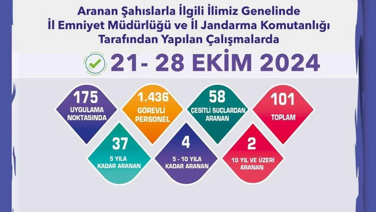 Edinilen bilgilere göre, İl Emniyet Müdürlüğü'ne ve İl Jandarma Komutanlığı'na bağlı ekipler tarafından kent genelindeki 175 uygulama noktasında, bin 436 personelin katılımıyla denetim gerçekleştirildi. Denetimlerde, çeşitli suçlardan aranan 58 şahıs yakalanarak gözaltına alındı. Ayrıca farklı suçlardan farklı sürelerde hapis cezası olduğu belirlenen 43 şüpheli hakkında da gerekli işlemlerin yapıldığı öğrenildi.