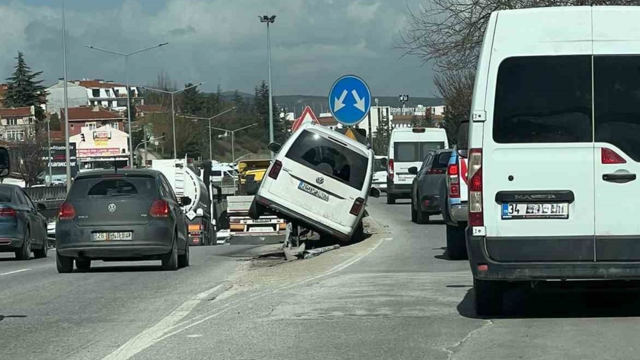 Bariyerlerin üzerinde asılı kalan araç, yoldan geçen diğer sürücülerin kamerasına yansıdı. Polis ekipleri kazayla ilgili inceleme başlattı.