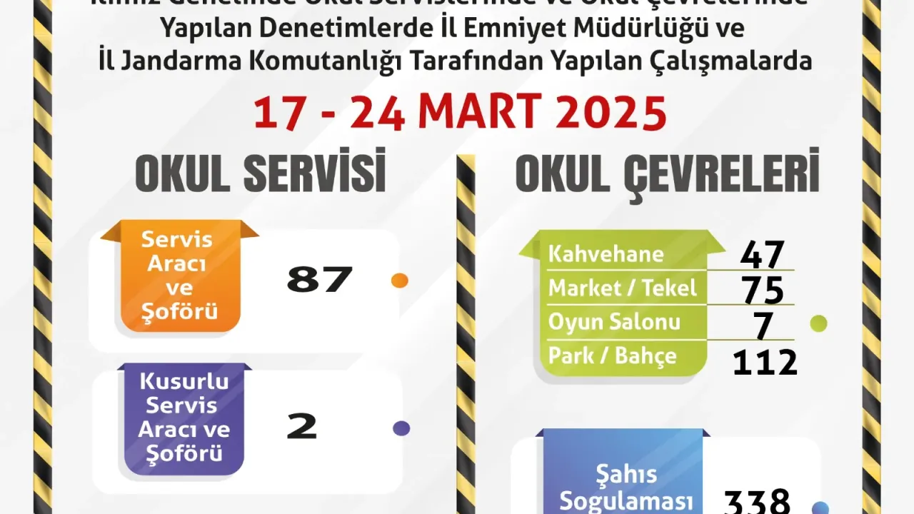Geçen hafta 87 okul servisi ve şoförü denetlendi. İki kusurlu servis aracı ve şoför tespit edildi. Okul çevrelerinde toplam 47 kahvehane, 75 market/tekel bayii, 7 oyun salonu ve 112 park/bahçe kontrol edildi. Okul çevresinde dolaşan 338 kişi sorgulandı.