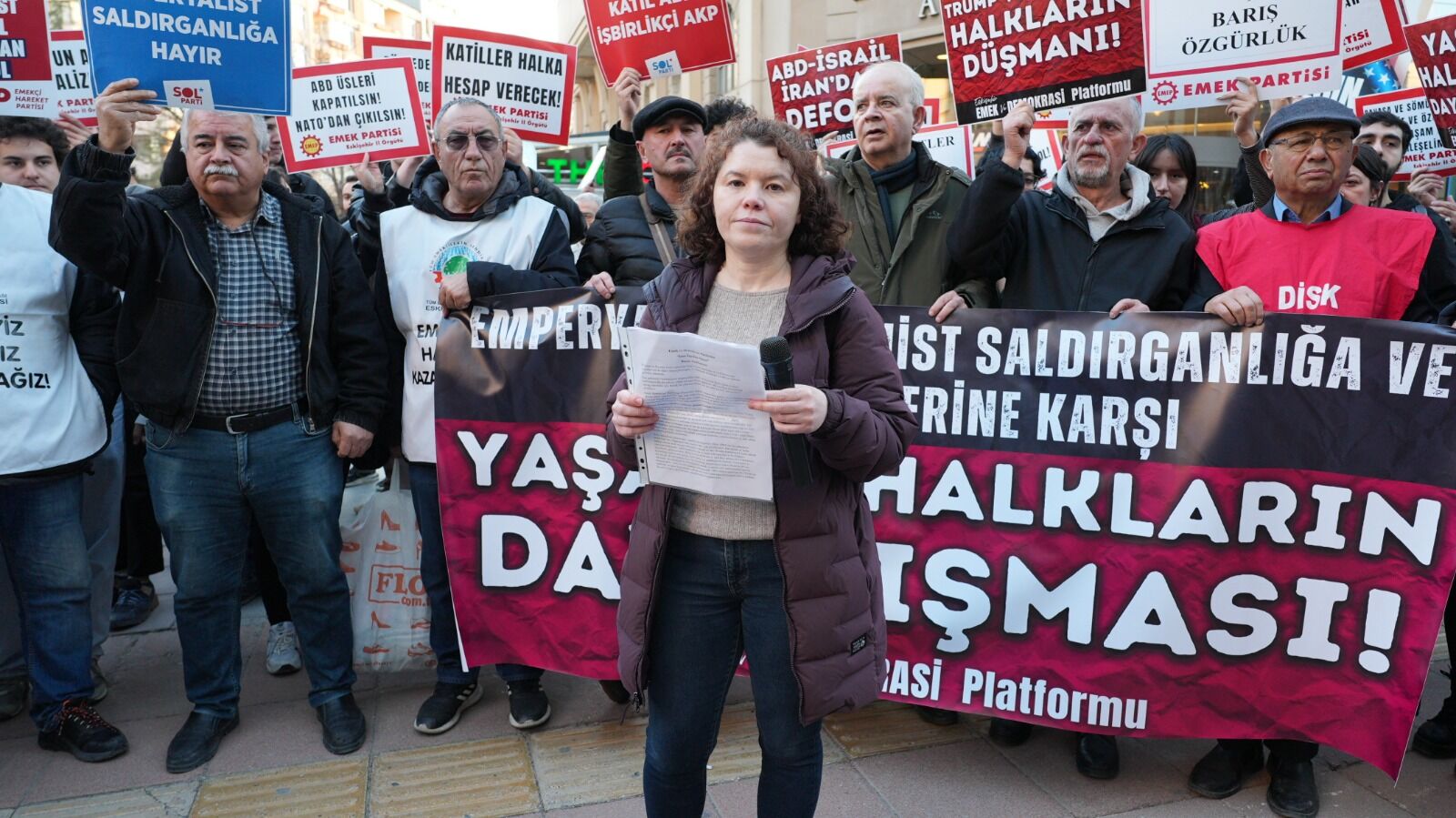 Emek ve Demokrasi Platformu adına konuşan Bengi Yıldırım, 28 Şubat’ta başlayan saldırıların Ortadoğu’da gerilimi artırdığını ifade ederek “28 Şubat’ta Siyonist İsrail rejiminin İran’a karşı başlattığı savaş, emperyalist Amerika’nın da dâhil olmasıyla bugün 5. gününde Ortadoğu’yu ateş çemberine çevirmiş durumda" ifadelerini kullandı.