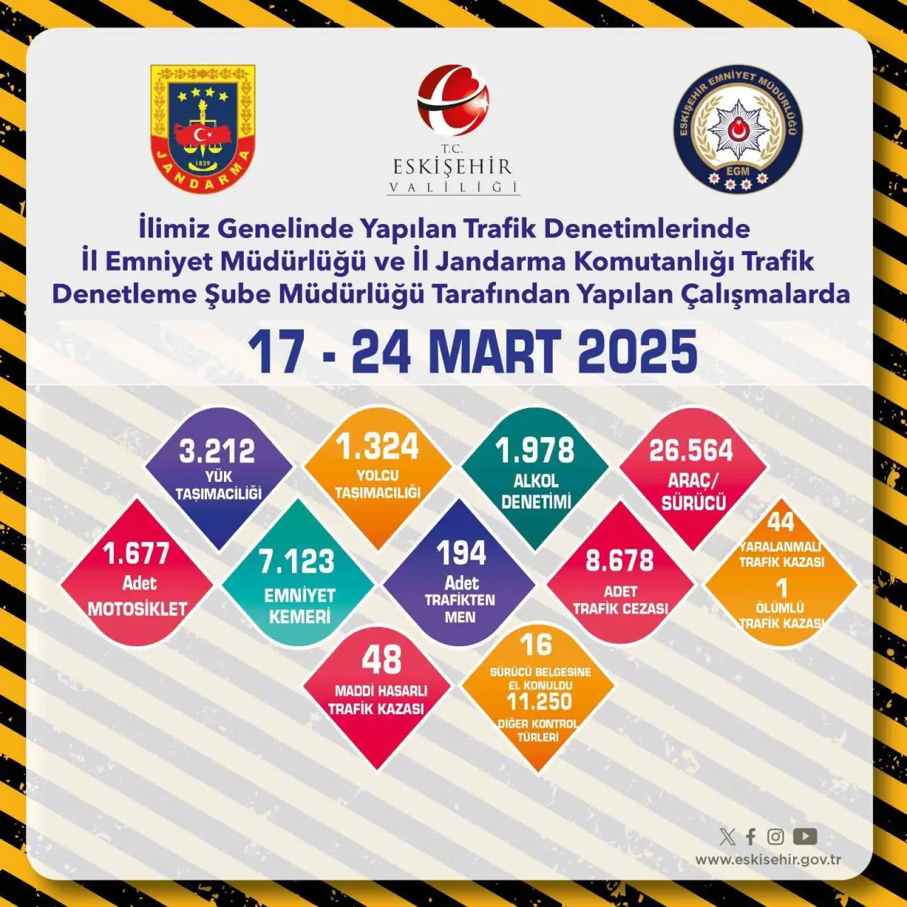 Edinilen bilgilere göre, İl Emniyet Müdürlüğü ve İl Jandarma Komutanlığı ekiplerince trafik denetimleri yapıldı. Kent genelinde 17-24 Mart 2024 tarihleri arasında yapılan denetimlerde; 3 bin 212 yük taşımacılığı, bin 324 yolcu taşımacılığı, bin 978 alkol denetimi, bin 677 motosiklet, 7 bin 123 emniyet kemeri ve 11 bin 250 diğer kontrol türleri gerçekleştirildi. Toplam 26 bin 564 araç ve sürücünün denetlendiği çalışmalar sonucunda 8 bin 678 adet trafik cezası yazılırken, 194 adet trafikten men yapıldı ve 16 sürücü belgesine el konuldu. Ayrıca çalışmalar sırasında polis ekiplerince 44 yaralanmalı, 1 ölümlü ve 48 maddi hasarlı trafik kazasına müdahale edildi.