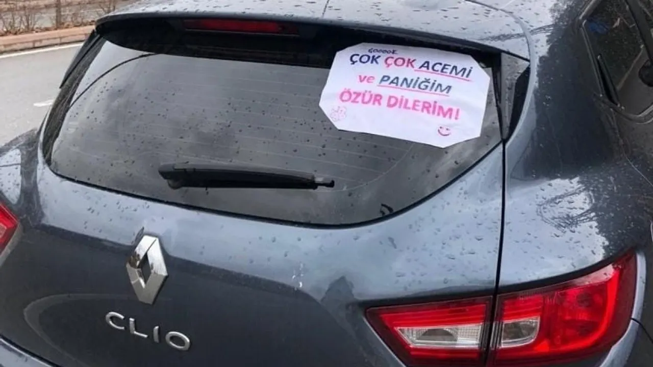 Tepebaşı ilçesi Şirintepe Mahallesi’nde park halindeki bir hatchback otomobilin arka camına asılan yazı dikkat çekti. Yazıda, “Çok çok acemi ve paniğim özür dilerim!” ifadeleri ve gülücük yer aldı. Acemiliğini samimi bir şekilde anlatan vatandaş, başta sürücüler olmak üzere görenlerin yüzünü gülümsetti.