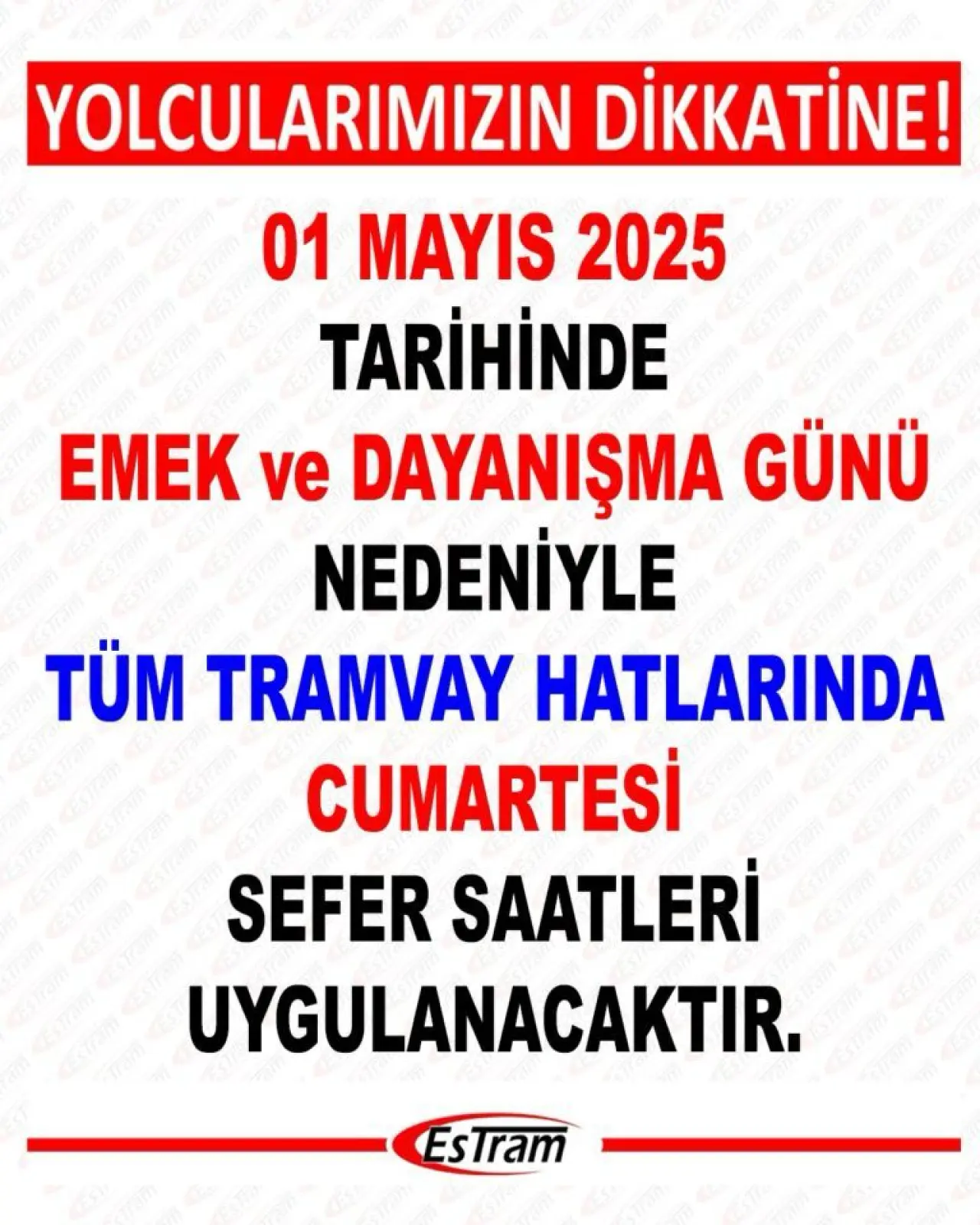 Eskişehir Hafif Raylı Sistem İşletmesi (EsTram) tarafından yapılan açıklamaya göre, 1 Mayıs 2025 Perşembe günü, Emek ve Dayanışma Günü dolayısıyla tüm tramvay hatlarında seferler “Cumartesi tarifesi”ne göre gerçekleştirilecektir denildi.
