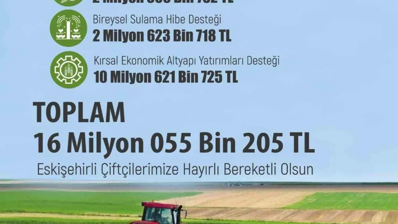'Eskişehir'de 16 milyon 55 bin 205 TL tarımsal destekleme ödemesini üreticimizin hesabına aktarıyoruz. Hayvan hastalıkları tazminatı desteği kapsamında 10 yetiştiricimize 2 milyon 809 bin 762 TL, bireysel sulama sistemleri desteği kapsamında 11 üreticimize 2 milyon 623 bin 718 TL, kırsal ekonomik altyapı yatırımları desteği kapsamında 13 yatırımcımıza 10 milyon 621 bin 725 TL olmak üzere toplamda 16 milyon 055 bin 205 tl hibe ödemesini yapıyoruz. Kırsal kalkınma destekleri ekonomik yatırımlar ve altyapı yatırımları hibe desteği kapsamında Sarıcakaya ilçesinde 7 sera yapımına 6 milyon 402 bin 576 TL, Tepebaşı ilçesinde 4 sera yapımına 3 milyon 980 bin 699 TL, Mihalgazi ilçesinde 1 sera yapımına 153 bin 450 TL, Mahmudiye ilçesinde 1 makine ekipman alımına 85 bin TL olmak üzere 13 yatırımcıya 10 milyon 622 bin 340 TL, kırsal kalkınma yatırımlarının desteklenmesi programı bireysel sulama makine ve ekipman alımları desteklenmesi hibe desteği kapsamında Sivrihisar ilçesindeki 5 çiftçiye 1 milyon 318 bin 128 TL, Çifteler ilçesindeki 2 çiftçiye 220 bin 959 TL, Seyitgazi ilçesindeki 2 çiftçiye 485 bin 684 TL, Mahmudiye ilçesindeki 1 çiftçiye 101 bin 870 TL, Odunpazarı İlçesindeki 1 çiftçiye 497 bin 76 TL olmak üzere Bireysel Sulama Hibe Desteği kapsamında 11 çiftçiye 2 milyon 623 bin 718 TL, hayvan hastalıkları tazminatı desteği kapsamında 10 yetiştiricimize 2 milyon 809 bin 762 TL olmak üzere toplamda 16 milyon 55 bin 205 TL hibe ödemesini yapıyoruz.'