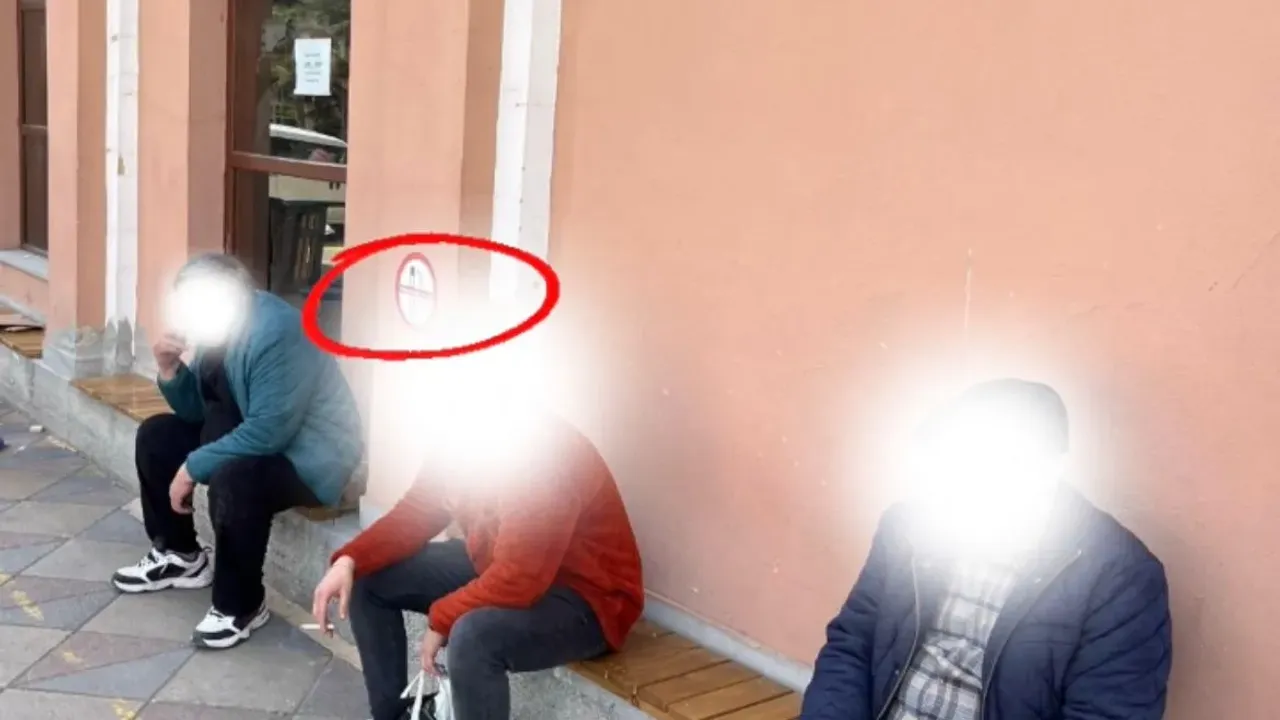 Eskişehir Kent Lokantası’nın ön cephesinde yer alan “Bu alanda sigara içilmez” tabelasına rağmen bazı vatandaşlar, lokanta girişindeki banklarda sigara içmeyi sürdürdü.