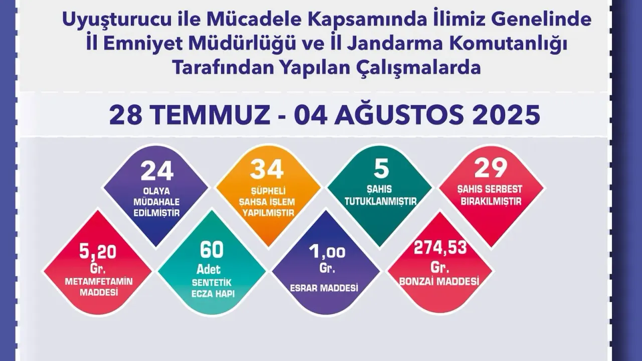 Bir haftalık dönemde uyuşturucu ile ilgili toplam 24 olaya müdahale edilirken, 34 şüpheli şahıs hakkında işlem yapıldı. Bu kapsamda: