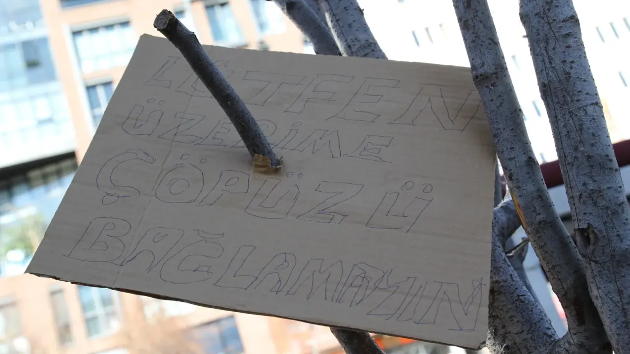 Duyarlı vatandaşlar tarafından ağaca asılan “Lütfen üzerime çöpünüzü bağlamayın” yazılı tabela dikkat çekerken, çevre sakinleri bu değişiklikten memnuniyet duyduklarını dile getirdi.