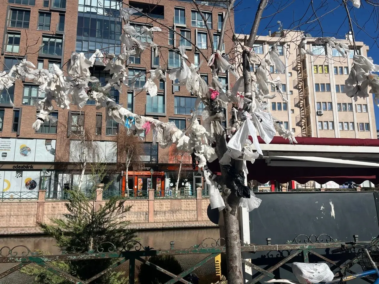 Eskişehir’in merkezi noktalarından birinde bulunan ve uzun süre çöp poşetlerinin asıldığı görüntüsüyle tepki çeken ağaç, temizlendi. Geçmişte plastik poşetlerle kaplanmış halde olan ağaç, hem çevre kirliliğine hem de görüntü kirliliğine neden olmuştu. Bugün ise ağacın tamamen temizlendiği ve dallarına hiçbir poşetin asılı olmadığı görüldü.