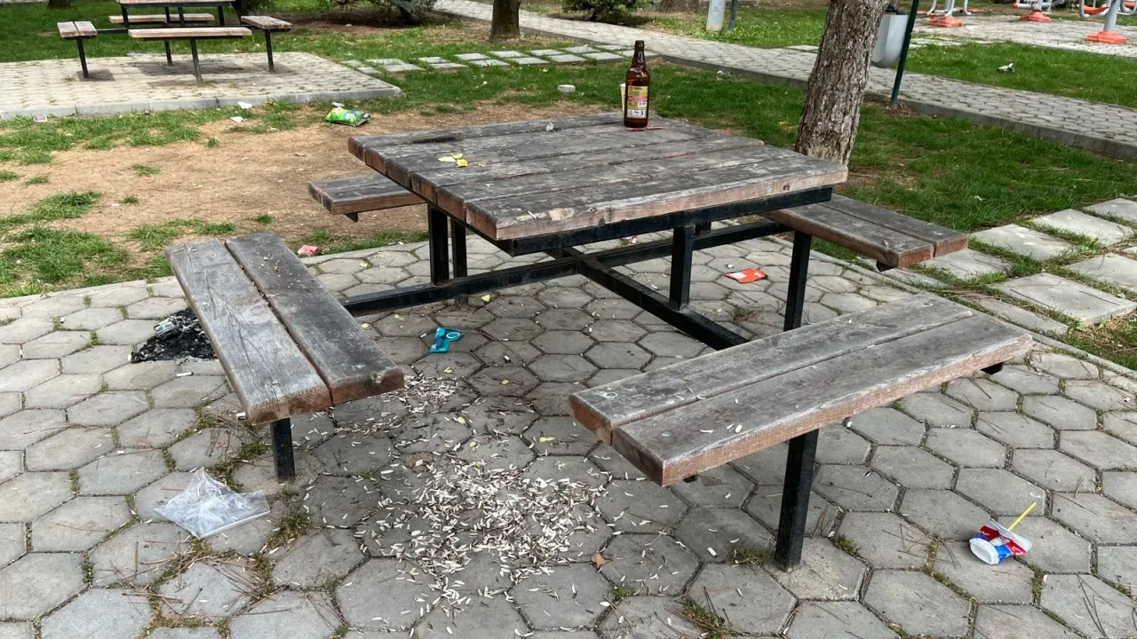 Parktaki oturma alanlarının çevresi ay çekirdeği kabuklarıyla kaplanmış durumda. Masaların üstünde içecek şişeleri bırakılmış, yere atılan plastik ambalajlar ve yanmış atıklar dikkat çekiyor. Spor aletleri ise amacının dışında kullanılıyor. Egzersiz aletlerinin üzerinde çekirdek poşetleri ve çöpler bırakılmış.