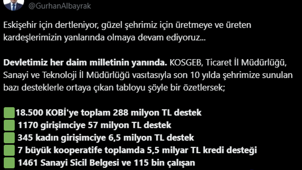 Başkan Albayrak yaptığı paylaşımda, "Devletimiz her daim milletinin yanında. Eskişehir için dertleniyor, güzel şehrimiz için üretmeye ve üreten kardeşlerimizin yanlarında olmaya devam ediyoruz" ifadelerini kullandı.