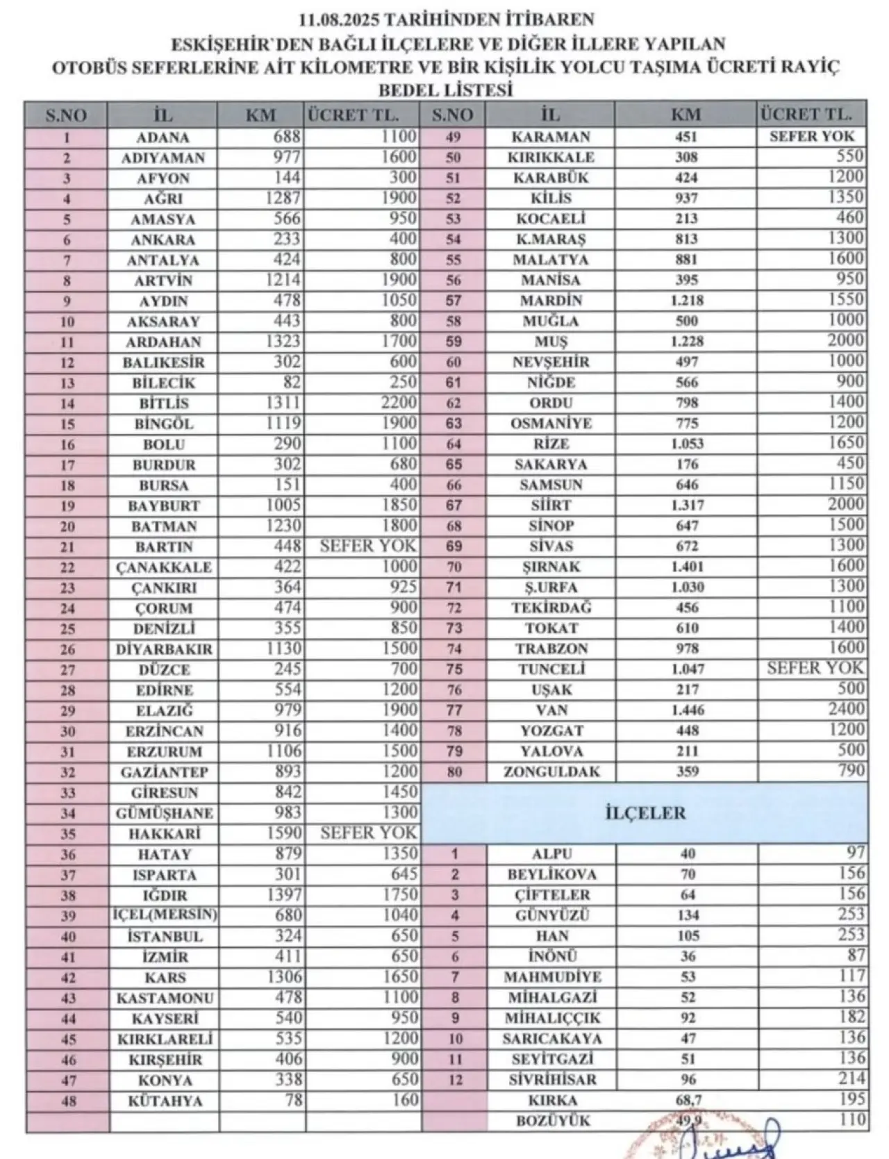 Yapılan düzenlemeye göre Eskişehir’den en kısa mesafeli sefer Kütahya’ya olacak. 78 kilometrelik yol için bilet ücreti 160 TL olarak belirlendi. En uzun mesafeli seferlerden biri ise 1.599 kilometre uzaklıktaki Hakkari’ye olacak, ancak bu hatta sefer bulunmadığı açıklandı. 1.446 kilometrelik Van hattı için bilet fiyatı 2.400 TL olurken, 1.228 kilometrelik Muş seferinin ücreti ise bin 2000 TL olarak ilan edildi.