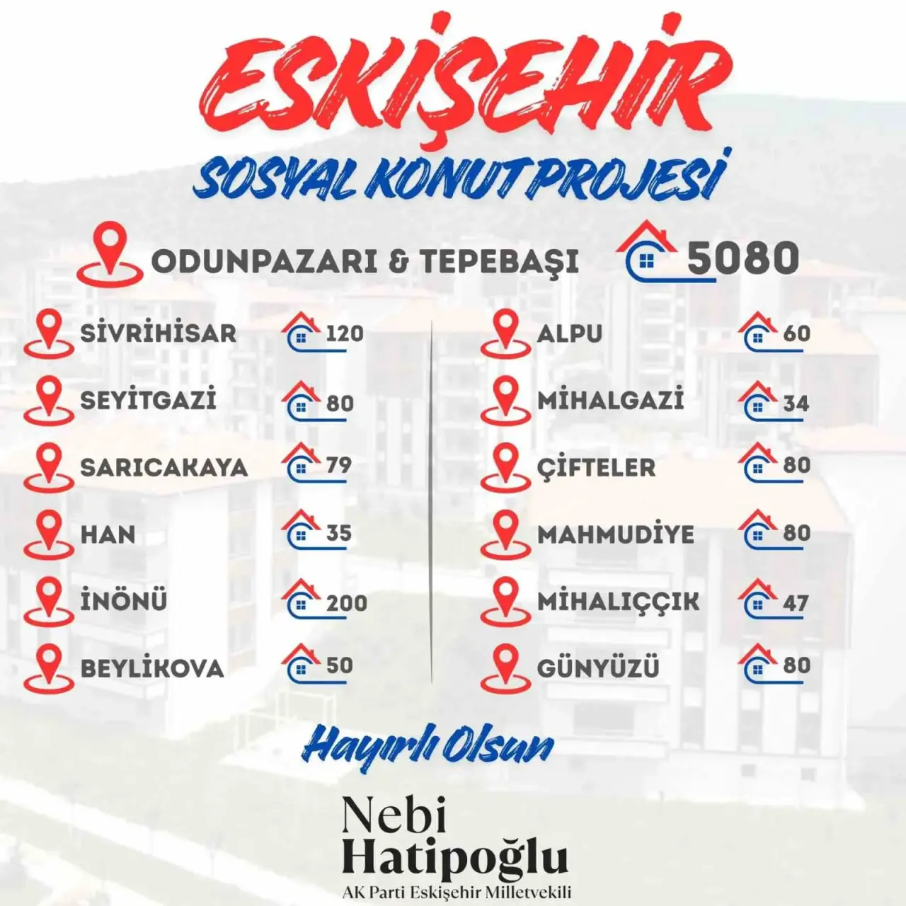 Proje kapsamında, Odunpazarı ve Tepebaşı ilçelerinde 5 bin 80, İnönü’nde 200, Sivrihsar’da 120 Seyitgazi, Çifteler, Mahmudiye ve Günyüzü ilçelerinde 80, Sarıcakaya’da 79, Alpu’da 60, Beylikova’da 50, Mihallıçık’ta 47, Han’da 35 ve Mihalgazi içlesinde 34 konut inşa edilecek. AK Parti Eskişehir Milletvekili Nebi Hatipoğlu yaptığı paylaşımda, "Eskişehir’imizin her köşesinde yeni yuvalar yükseliyor, umutlar büyüyor. Sosyal konut projesiyle vatandaşlarımızın sıcak bir yuvaya kavuşması için güçlü bir adım daha atıyoruz. Bu şehir, hizmetin en güzelini hak ediyor. Biz de her ilçemize dokunan, her haneye huzur getiren projelerle çalışmaya devam ediyoruz. Emeği geçen herkese gönülden teşekkür ediyor, Eskişehir’imize hayırlı olmasını diliyorum" ifadelerine yer verdi.