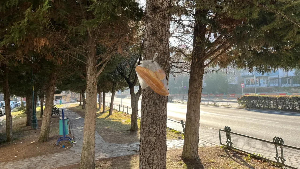 Mahallede çekilen görüntülerde, plastik bir poşet içindeki ekmeğin bir ağacın dalına asıldığı görülüyor. Bu alışılmadık yöntem, görenleri hem şaşırttı hem de düşündürdü.
