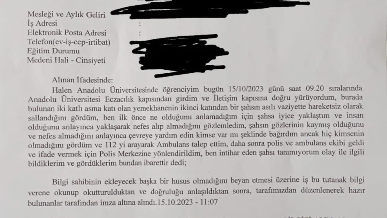15 Ekim 2023 tarihinde, Anadolu Üniversitesi Yunus Emre Kampüsü'nde üzücü bir olay yaşandı. Bir öğrenci, yemekhanenin trabzanlarına asarak intihar etti. Sabah saatlerinde bu trajik olayı gören bir başka öğrenci, hemen sağlık ekipleri ve emniyet güçlerine haber verdi. Ertuğrulgazi Polis Merkezi'nde verdiği ifadesinde, olayı gören öğrenci şunları aktardı: "Hâlâ Anadolu Üniversitesi öğrencisiyim. 15 Ekim 2023 tarihinde saat 09.20 civarında Anadolu Üniversitesi Eczacılık binasından geçerken, yemekhane binasının ikinci katında bir kişinin asılı vaziyette olduğunu gördüm. İlk başta ne olduğunu anlayamadım, yaklaştıkça kişinin hareketsiz olduğunu ve nefes almadığını fark ettim. Hemen yardım çağırarak 112 acil hattını aradım. Daha sonra polis ve ambulans ekibi geldi ve beni ifade vermek için yönlendirdiler. İntihar eden kişiyi tanımıyorum ve bildiklerim bu kadar.