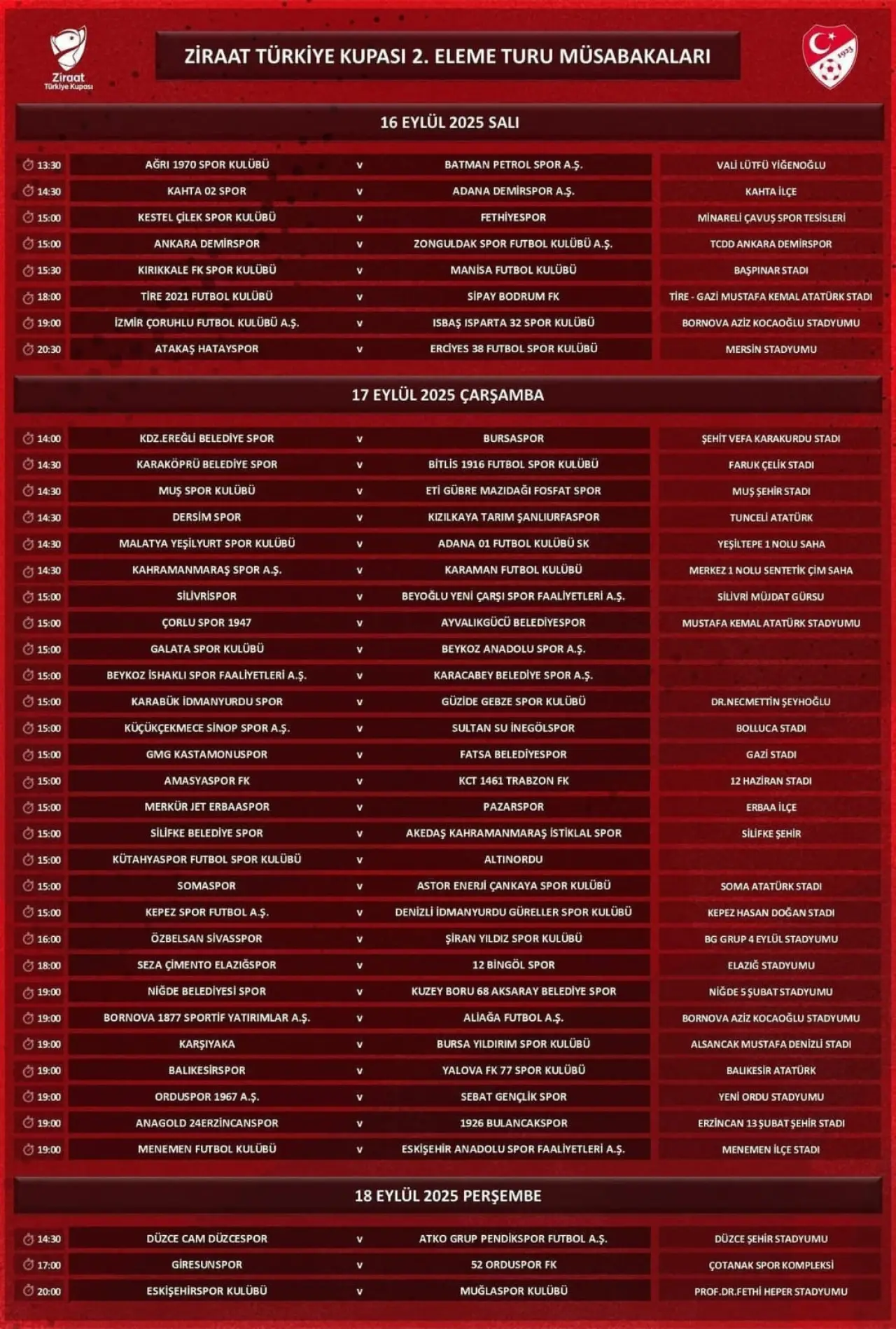 Ziraat Türkiye Kupası 2. Eleme Turu müsabakalarına ilişkin program açıklandı.