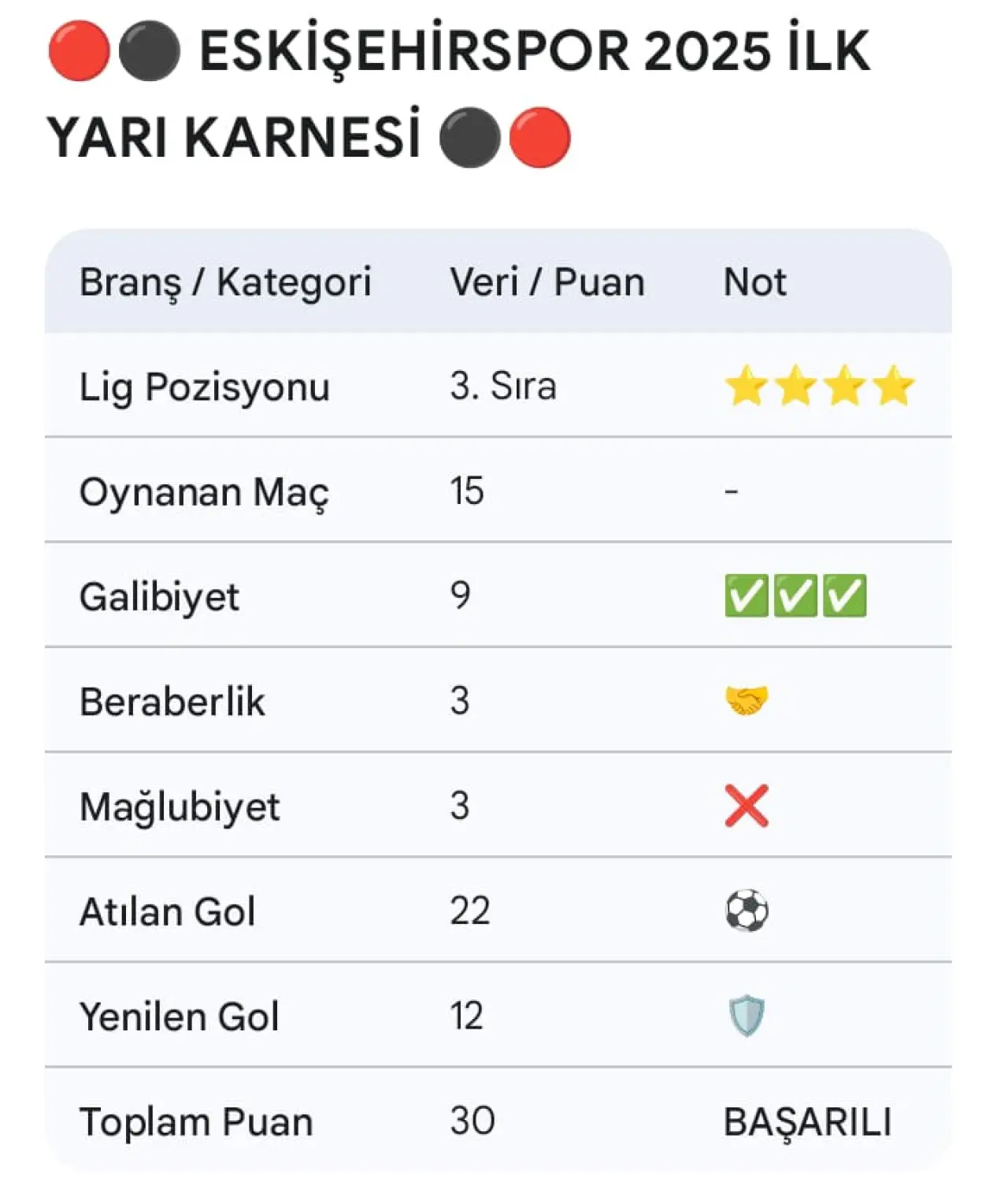 "Eskişehirspor, 2025 yılı ilk yarısında küllerinden doğuş hikayesini başarıyla sürdürdü. Şehir ve takım bütünleşmiş durumda. Disiplinli oyun devam ederse, bu yolun sonu şampiyonluk!"