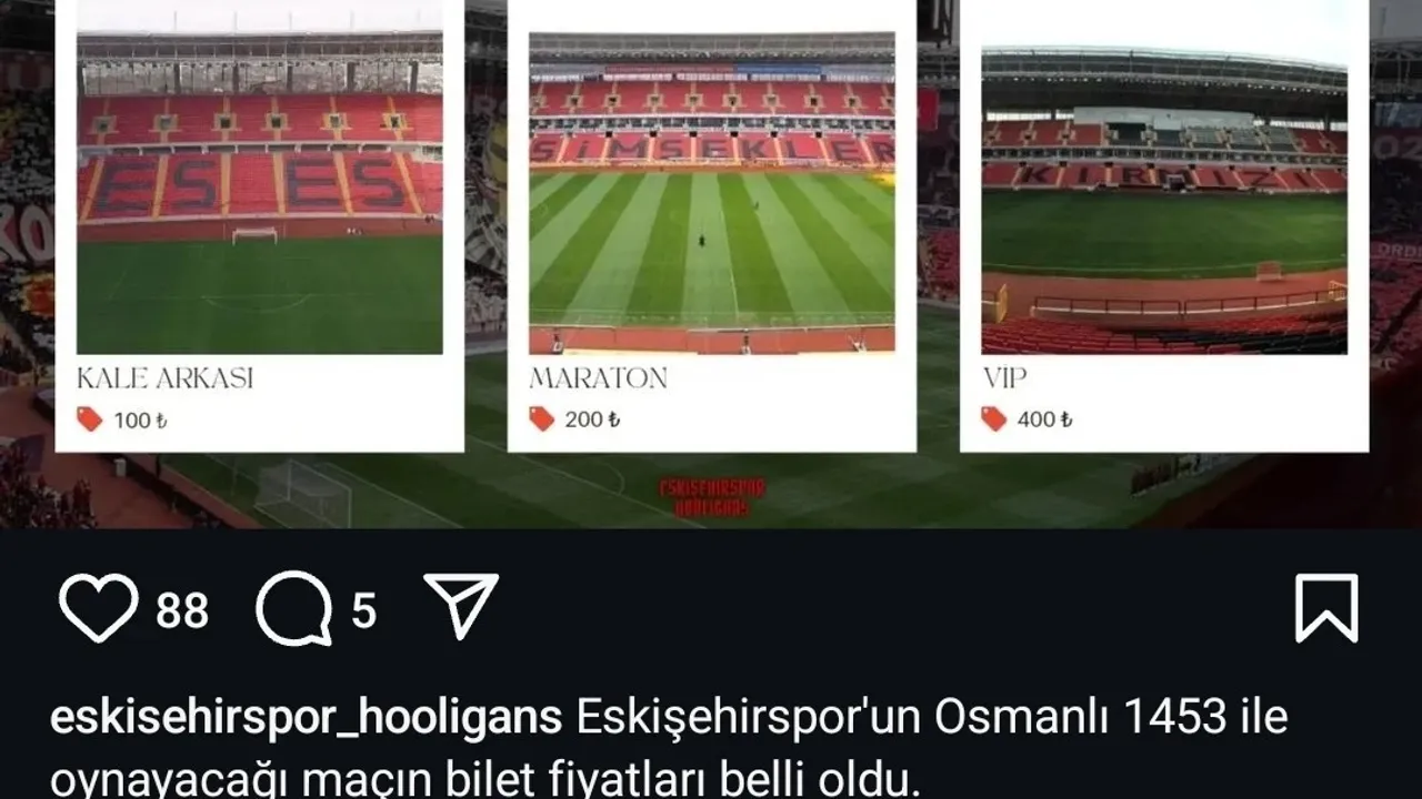 Eskişehirspor'un Osmanlı 1453 ile yapacağı maçın bilet fiyatları açıklandı. Taraftarlar, 100 TL'den başlayan fiyatlarla bu önemli maça katılma fırsatı bulacak. Kale arkası bilet fiyatları 100 TL olarak belirlenirken, maraton tribünündeki yerler 200 TL, VIP tribünü ise 400 TL'den satışa sunulacak. Eskişehirspor, kritik karşılaşmada taraftarlarının desteğini arkasına almayı hedefliyor. Taraftarlar şimdiden tribünleri doldurmak için hazırlık yapıyor.