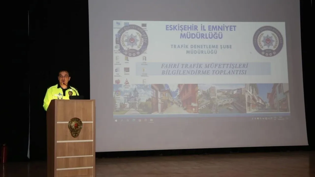 Eskişehir Trafik Denetleme Şube Müdürlüğünce, fahri trafik müfettişlerinin katılımıyla, Eskişehir İl Emniyet Müdürlüğü konferans salonunda, bilgilendirme ve değerlendirme toplantısı düzenlendi. Trafik müfettişlerine, kural ihlali gerçekleştiren sürücülere trafik kural ihlali tespit tutanağı düzenlenirken dikkat edilecek hususlar, ihlal tespit tutanakları ve bu tutanakların dönüştürülmesi sonucu oluşan idari para cezası karar tutanaklarına ilişkin veriler ile mevzuat değişiklikleri hakkında gerekli bilgilendirmeler yapıldı.