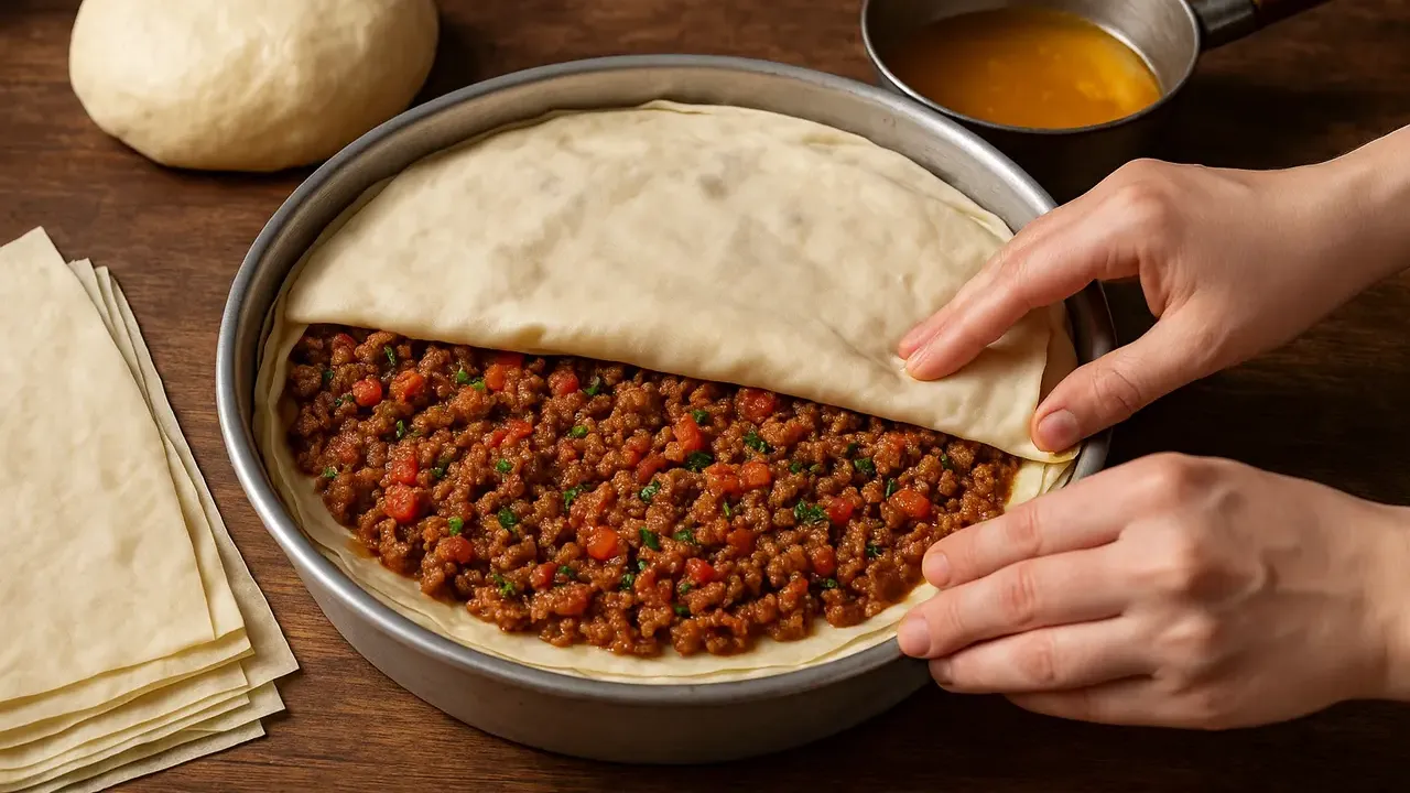 Kat kat dizme: Tepsiyi yağlayın. Bir yufkayı serin, üzerine iç harçtan yayın. Bu işlemi 4–5 kat olacak şekilde tekrarlayın ve en üste yufkayı kapatın.