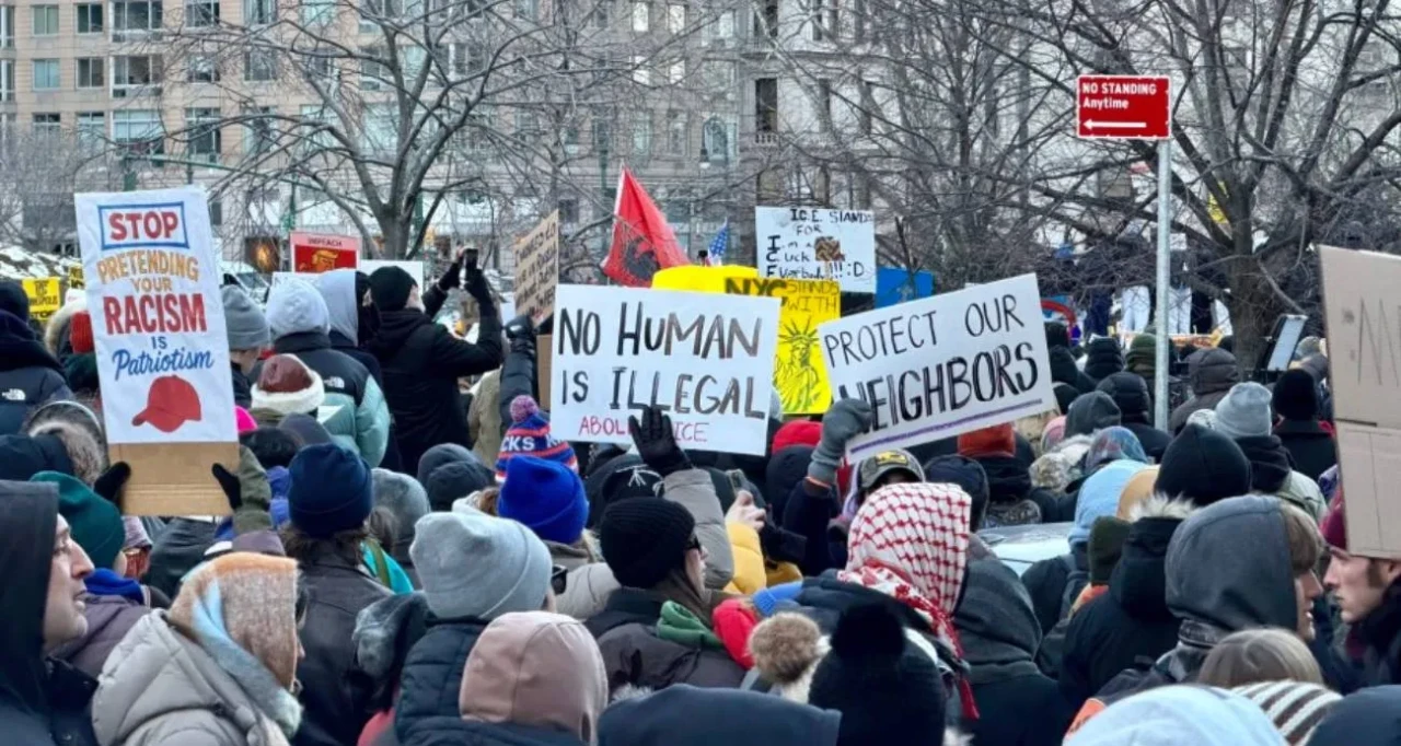 New York’un Manhattan bölgesinde, dondurucu soğuğa rağmen binlerce kişi Foley Meydanı’nda bir araya geldi. Yaklaşık 7 bin kişinin katıldığı gösteride, Minnesota eyaletinin Minneapolis kentinde ABD vatandaşları Renee Good ve Alex Pretti’nin hayatını kaybettiği olayların ardından göçmenlere yönelik baskılar ve ICE faaliyetleri protesto edildi. Göstericiler, “ICE, NYC’den defol”, “Trump şimdi gitmelisin” ve “Adalet istiyoruz” sloganları atarak el yapımı pankartlar taşıdı. Protesto, New York Polis Teşkilatı’nın aldığı yoğun güvenlik önlemleri altında olaysız şekilde sona erdi.