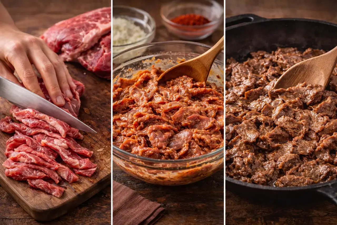 Dinlendirme: Dilimlediğiniz etleri bu sosa iyice bulayın. Kabın üzerini streç filmle kapatıp buzdolabında en az 12 saat (mümkünse 24 saat) bekletin. Bu süreç etin yumuşacık olmasını sağlar.