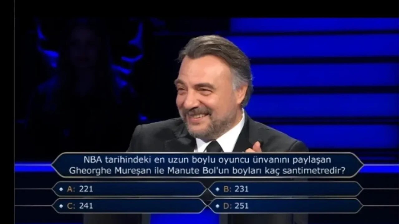 NBA liginin dev isimlerinin boylarını soran bu sorunun doğru yanıtı B şıkkı: 231 olarak açıklanmıştır. Rumen asıllı Gheorghe Mureşan ve Sudanlı Manute Bol, resmî kayıtlara göre 231 santimetre (7 fit 7 inç) boylarıyla NBA tarihinde en uzun oyuncu unvanını ortaklaşa taşımaktadırlar. Bu iki oyuncu, kariyerleri boyunca uzun boyları sayesinde basketbol sahalarında dikkat çekmişlerdir.