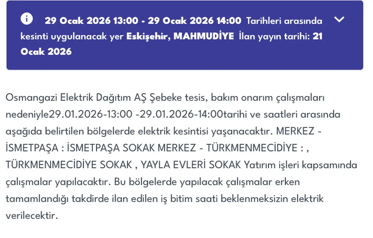 Mahmudiye genelinde bakım çalışmaları kapsamında enerji kesintisi uygulanacaktır.