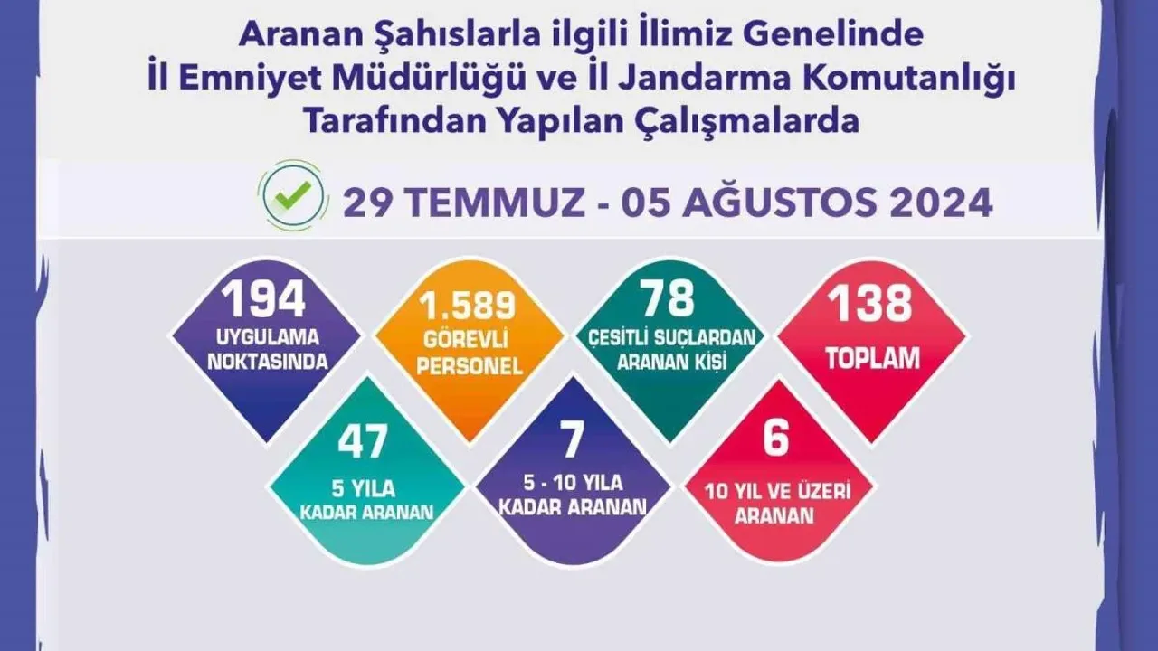 Edinilen bilgilere göre, İl Emniyet Müdürlüğü'ne ve İl Jandarma Komutanlığı'na bağlı ekipler tarafından 29 Temmuz ile 5 Ağustos tarihleri arasında aranan şahısların yakalanması amacıyla çalışma gerçekleştirildi. Çalışmalar neticesinde 194 farklı uygulama noktasında bin 589 personel ile yapılan denetimlerde, farklı suçlardan aranma kaydı bulunan 78 şüpheli ile farklı sürelerde kesinleşmiş hapis cezası bulunan 60 kişi yakalandı.