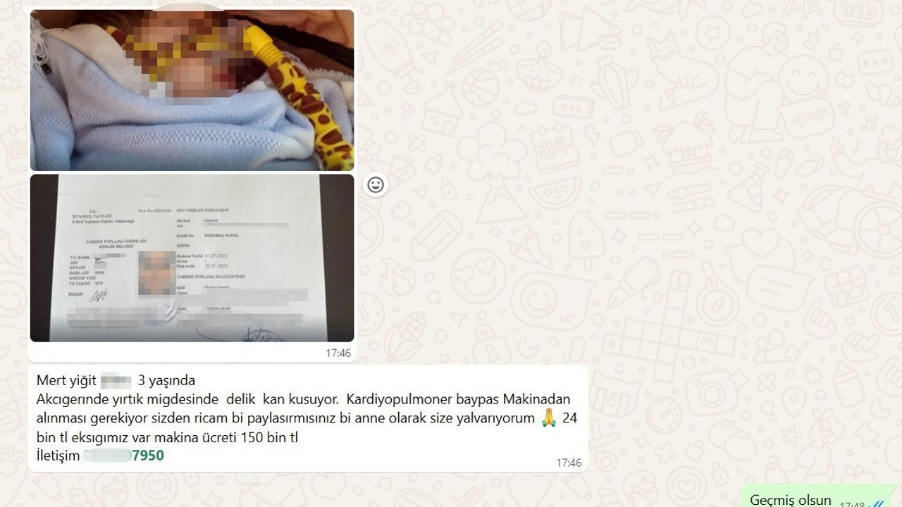 Kısa süre sonra aynı basın mensubuna, kendisini A.B. olarak tanıtan başka bir şahıs yazdı. Bir anne olduğu belirten şahıs; akciğerinde yırtık ve midesinde delik olan M.Y.B. isimli 3 yaşındaki çocuğunun kan kustuğunu, 150 bin TL’ye makine almaları gerektiğini dile getirdi. Yaklaşık 24 bin TL açıkları olduğundan bahseden şahıs, aynı şekilde bir sosyal medya paylaşımı yapılmasını istedi. Şahıs ayrıca, İstanbul Valiliği İl Sivil Toplum Müdürlüğü’nün onayı dahilinde bağış kampanyası yürüttüklerini öne sürerek belge paylaştı.