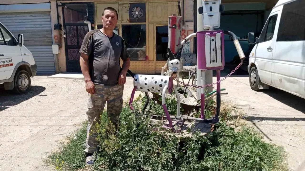 Otomobillerde egzoz, kaporta ve boya gibi sanayi işleriyle uğraşan Ercan Ay, yaklaşık 5 yıl önce elindeki çürük parçalarla ilginç şekiller yaptı. Hurda egzoz parçaları ile insan ve köpek figürü oluşturan Ay, dükkanının maskotunu kendi elleriyle tasarladı. İlginç görüntülü figürler, müşterilerin de beğenisini kazandı. Esnaf, vatandaşlar isterse ilerleyen günlerde bu tarz figürlerin yenisini yapabileceğini ifade etti.