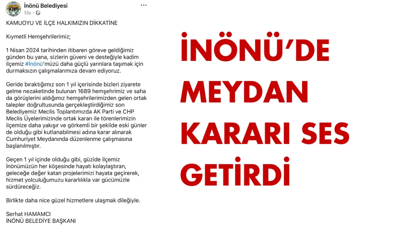İnönü Belediyesi’nin, resmi sosyal medya hesabından yaptığı kamuoyu açıklaması ilçede dikkat çekti. AK Parti ve CHP'li meclis üyelerinin ortak kararıyla, ilçe genelinde yapılacak resmi törenlerin yeniden Cumhuriyet Meydanı’nda gerçekleştirilmesine karar verildiği duyuruldu.
