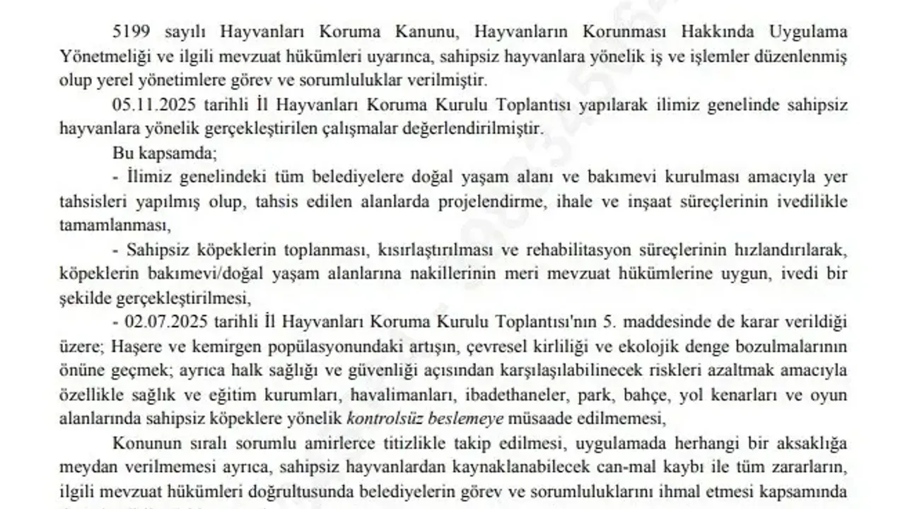 Resmi yazıda ayrıca, özellikle okullar, hastaneler, ibadethaneler, parklar ve oyun alanlarında oluşabilecek güvenlik risklerinin azaltılması için kontrolsüz beslemenin engelleneceği vurgulandı. Belediyelerin süreci hızlı ve etkin şekilde yürütmesi gerektiği ifade edildi.