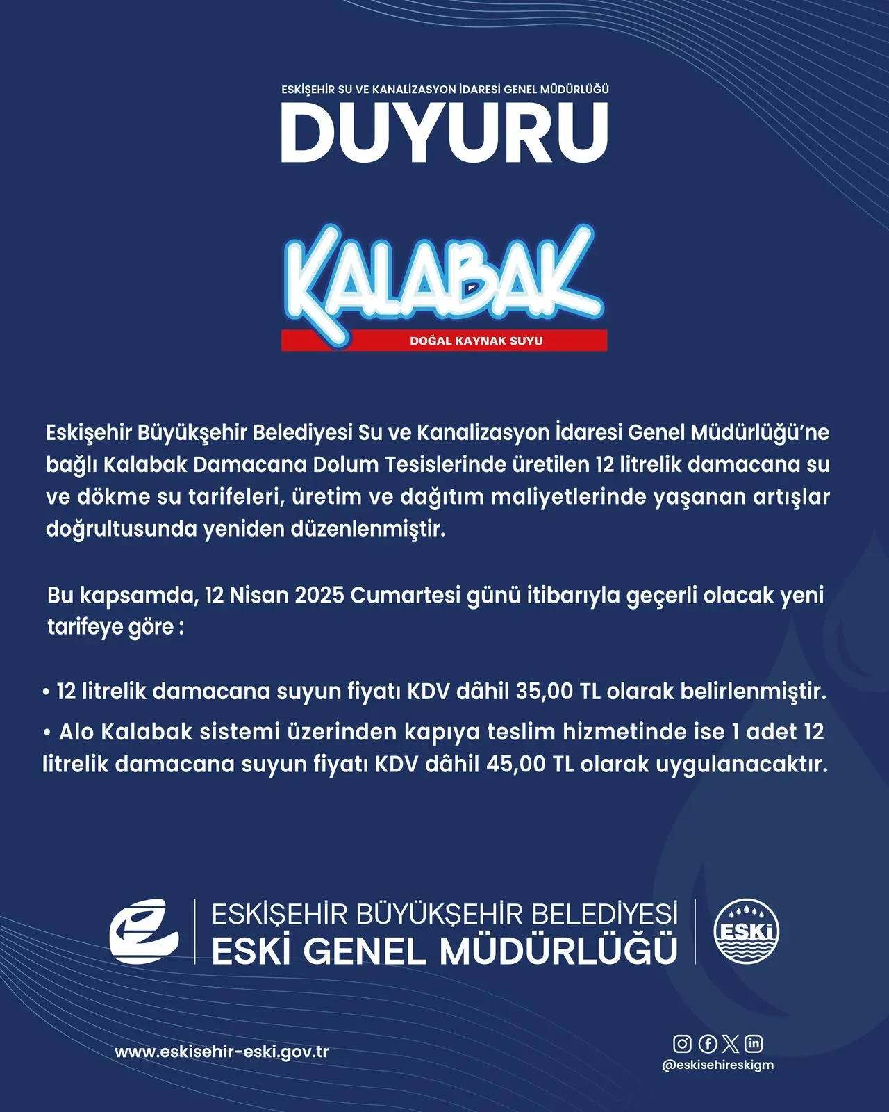 ESKİ yetkilileri tarafından yapılan bilgilendirmede, güncellenen fiyat tarifesinin maliyet artışlarına bağlı olarak hazırlandığı ifade edildi. Eskişehir genelinde yoğun olarak kullanılan Kalabak suyun yeni fiyatları, 12 Nisan itibarıyla yürürlüğe girecek.