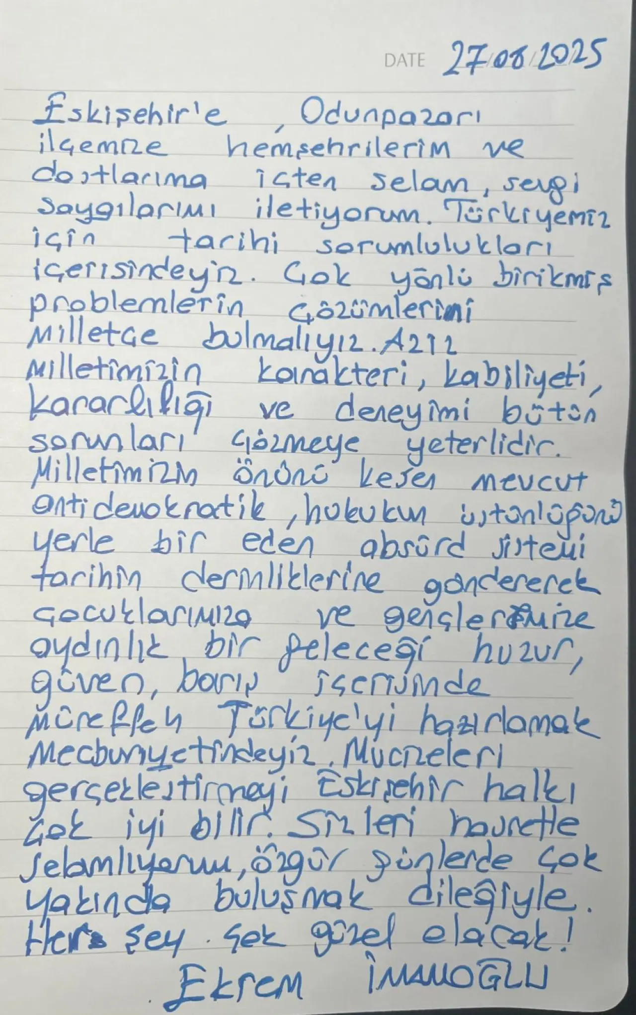 Ziyaret sırasında Ekrem İmamoğlu, Eskişehirlilere özel bir mesaj da iletti. Kendi el yazısıyla kaleme aldığı mesajda İmamoğlu, “Eskişehir'e, Odunpazarı ilçemize, hemşehrilerim ve dostlarıma içten selam, saygılarımı iletiyorum. Türkiyemiz için tarihi sorumluluklar içerisindeyiz. Çok yönlü birikmiş problemlerin çözümlerini milletçe bulmalıyız. Aziz milletimizin karakteri, kabiliyeti, kararlılığı ve deneyimi bütün sorunları çözmeye yeterlidir. Milletimizin önünü kesen mevcut anti demokratik, hukukun üstünlüğünü yerle bir eden absürt sistemi tarihin derinliklerine göndererek çocuklarımıza ve gençlerimize aydınlık bir geleceği, huzur, güven ve barış içerisinde müreffeh bir Türkiye’yi hazırlamak mecburiyetindeyiz. Mucizeleri gerçekleştirmeyi Eskişehir halkı çok iyi bilir. Sizleri hasretle selamlıyorum, özgür günlerde çok yakında buluşmak dileğiyle. Her şey çok güzel olacak!” ifadelerine yer verdi.