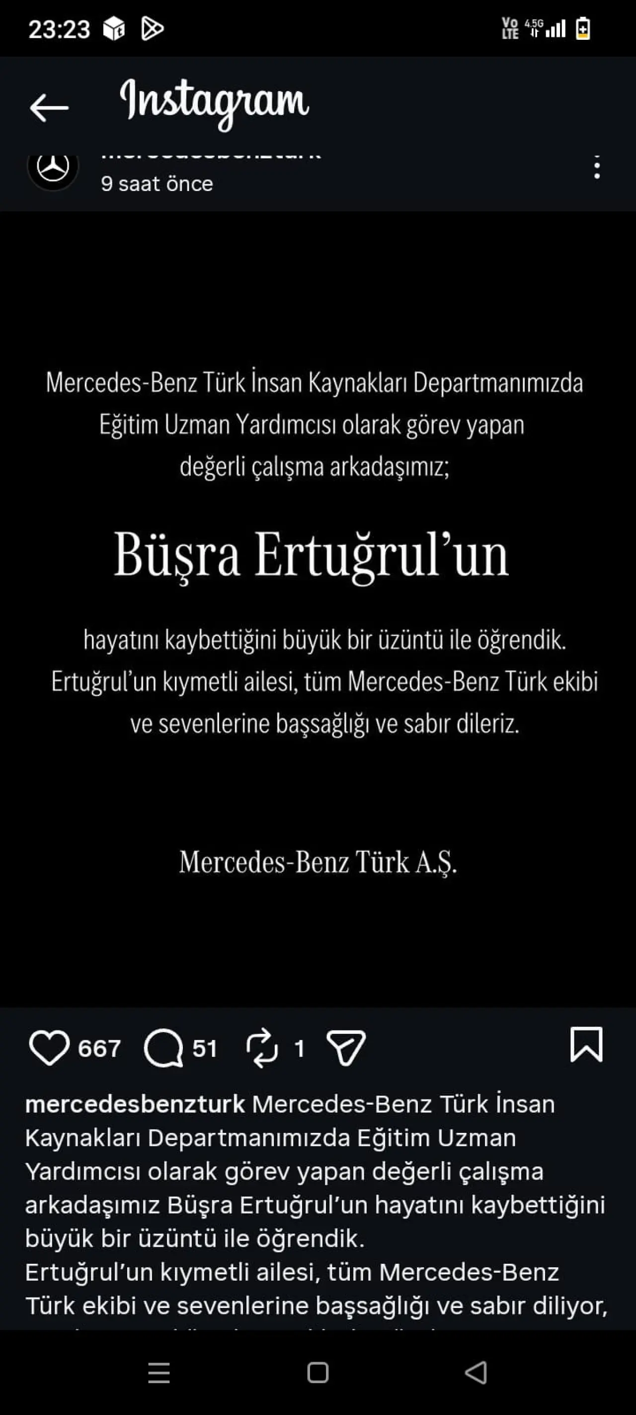 Mercedes-Benz Türk, değerli çalışanlarının hatırasını yaşatmaya devam edeceğini belirterek, ailesine ve tüm sevenlerine sabır ve başsağlığı diledi.