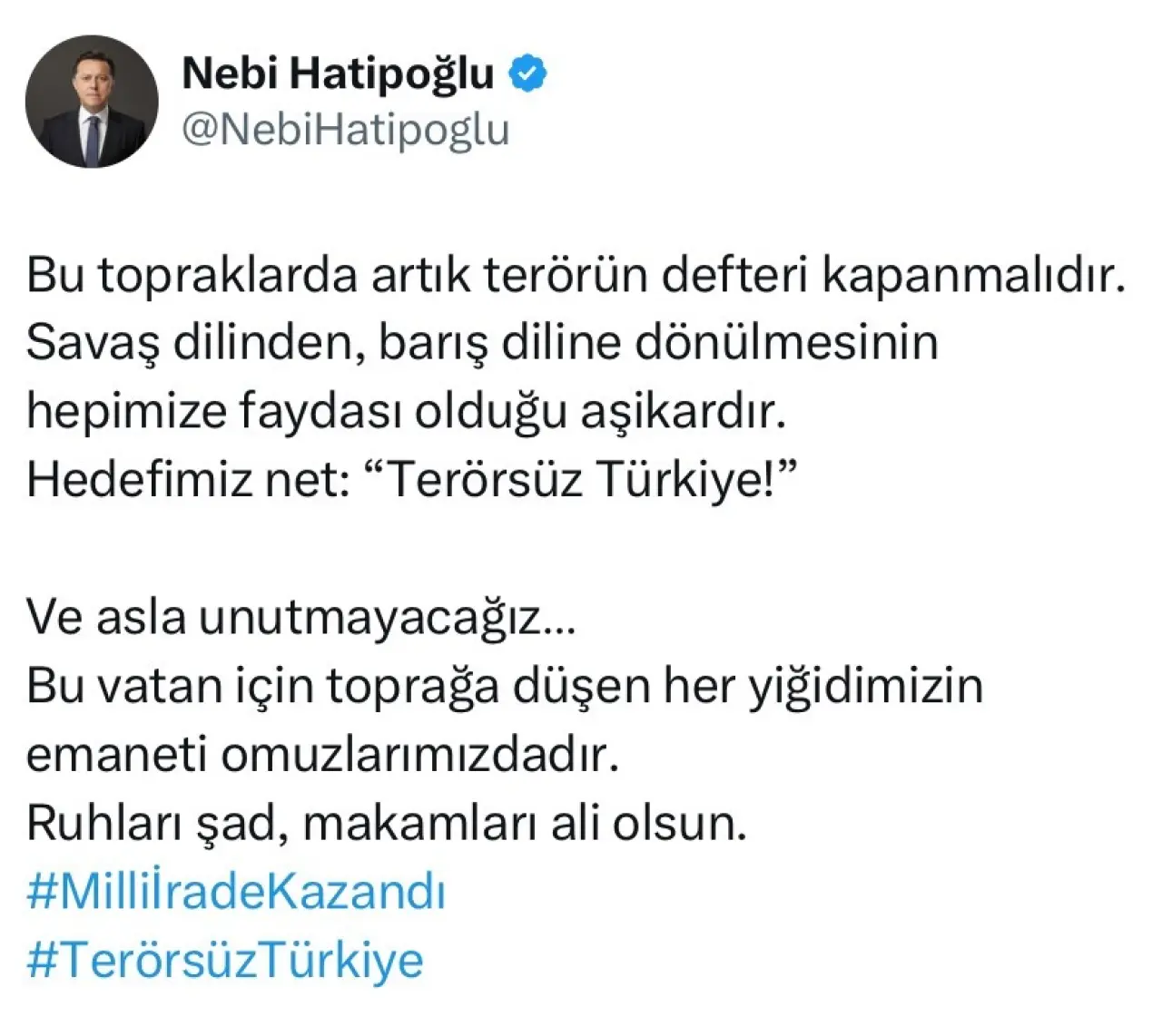 PKK terör örgütünün fesih edildiği geçtiğimiz gün duyuruldu. Siyasi isimler peş peşe konuyla ilgili değerlendirmede bulunurken, AK Parti Eskişehir Milletvekili Nebi Hatipoğlu açıklama yaptı. Açıklamasını sosyal medya hesabı üzerinden yayımlayam Milletvekili Hatipoğlu, "Bu topraklarda artık terörün defteri kapanmalıdır. Savaş dilinden, barış diline dönülmesinin hepimize faydası olduğu aşikardır. Hedefimiz net: ‘Terörsüz Türkiye!’ Ve asla unutmayacağız Bu vatan için toprağa düşen her yiğidimizin emaneti omuzlarımızdadır. Ruhları şad, makamları ali olsun" ifadelerine yer verdi.