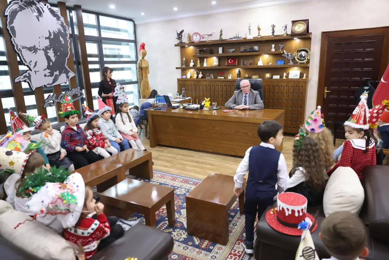 Neşeli halleriyle dikkat çeken çocuklar, ziyaret sırasında Başkan Kurt’un makam odasında bulunan yılbaşı ağacını birlikte süsledi. Renkli süsler ve kahkahalar eşliğinde gerçekleşen etkinlikte keyifli anlar yaşandı. Başkan Kazım Kurt, minik misafirlerine yeni yıl hediyesi verirken, çocuklar da Başkan Kurt için hazırladıkları hediyeleri takdim etti.