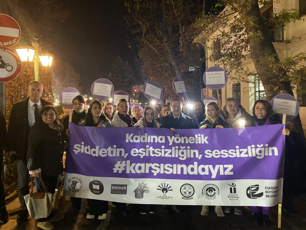 ‘Kadına Yönelik Şiddetle Mücadele’ kapsamında gerçekleştirilen Sessiz Yürüyüş’te katılımcı kuruluşlar arasından Eskişehir Barosu, Türk Tabipler Odası, Türk Mühendis Mimar Şehir Plancıları Odası, Tepebaşı Sağlıklı Kent Konsey, Büyükşehir Kent Konseyi, Odunpazarı Kent Konseyi, Odunpazarı Belediyesi, Tepebaşı Belediyesi ve Eskişehir Büyükşehir Belediyesi yer aldı.